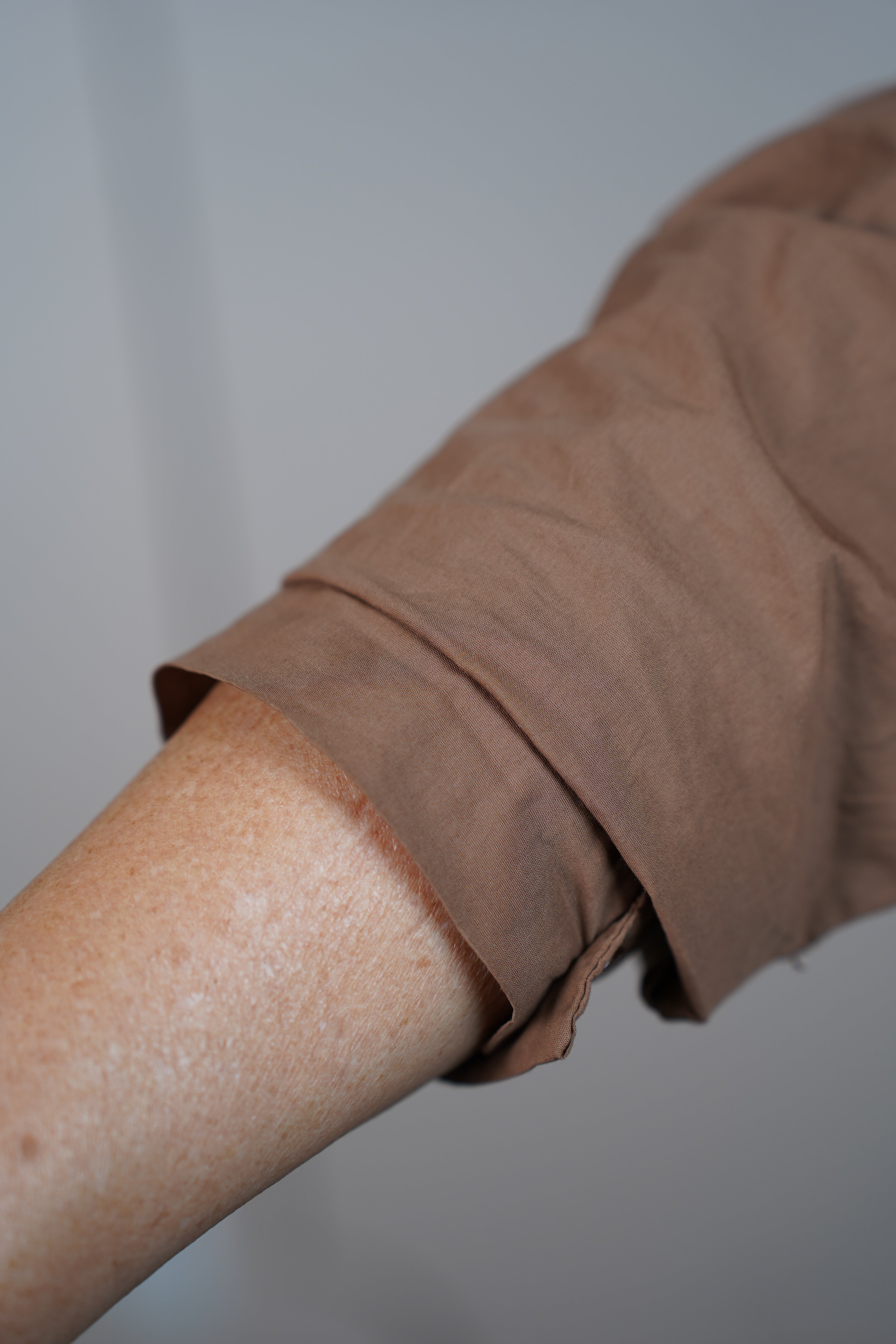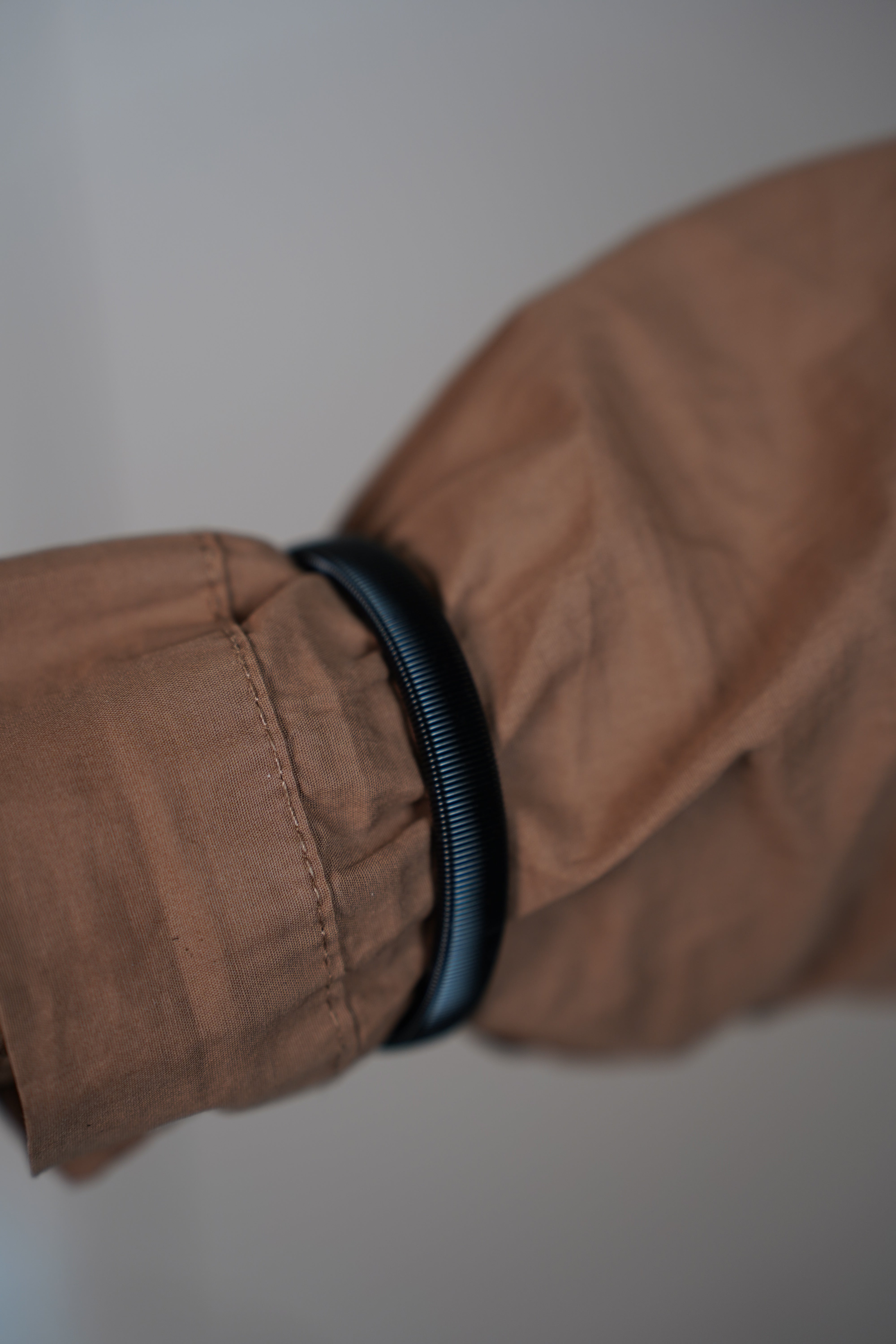 Close-up of classic elastic sleeve garters worn over a long-sleeve shirt, holding sleeves in place