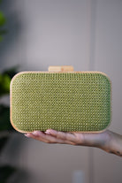Close-up of Solea Woven Box Clutch in green with wooden frame and woven texture.
