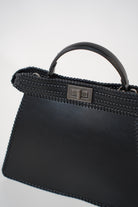 Solenne Leather Bag black structured top handle purse with woven trim and turn-lock closure