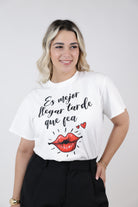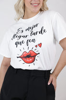 White graphic T-shirt with Spanish phrase and red lips illustration styled with black high-waisted shorts.