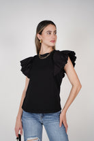 A chic black tee with dramatic ruffle shoulders for a modern, feminine twist on a classic style.