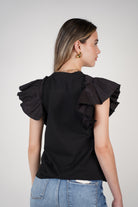 Black short-sleeve tee with statement ruffle shoulders