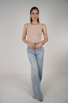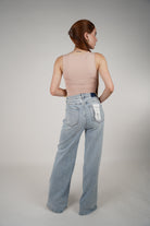 Model wearing high-rise, light wash wide-leg jeans paired with a nude tank top and gold accessories.