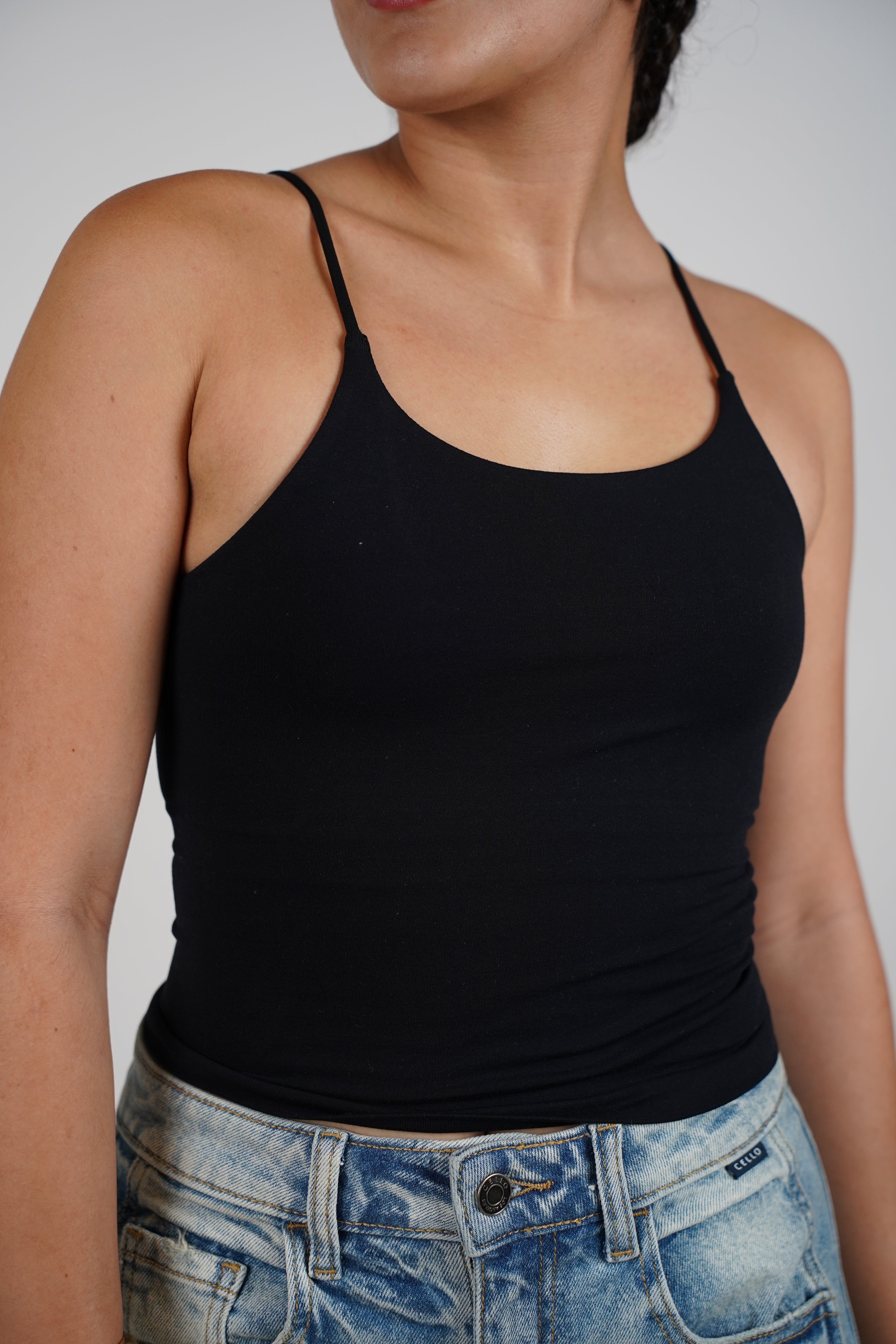 Meta Description: Vanu Spaghetti Strap Top in white – features a high neckline, cropped fit, and ultra-soft stretch fabric. A go-to essential for effortless everyday styling.