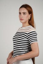 Striped knit t-shirt with sheer chest panel and short sleeves, black and white version