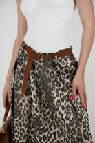 A statement leopard print skirt with a flowy silhouette and timeless elegance, perfect for versatile day-to-night looks.