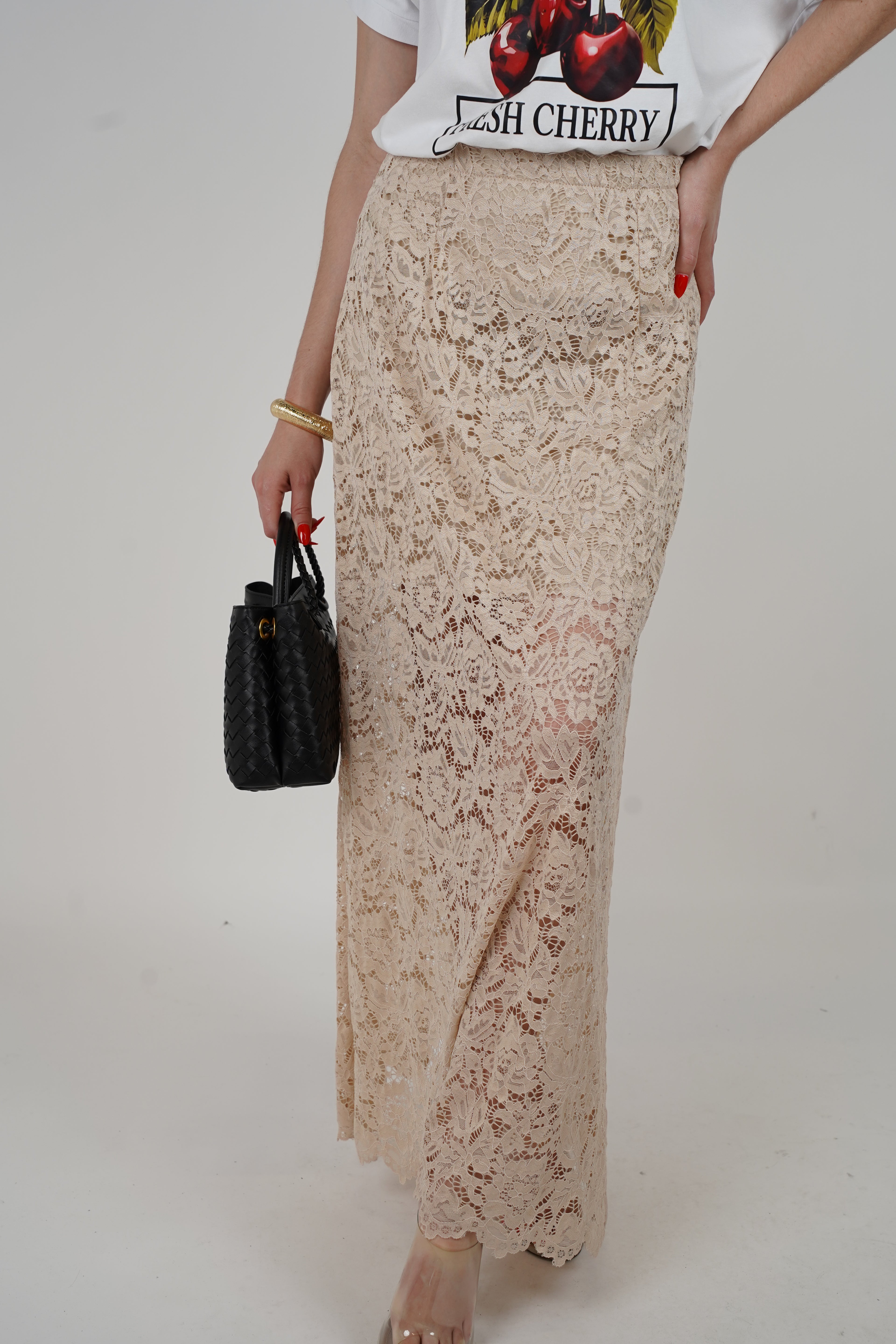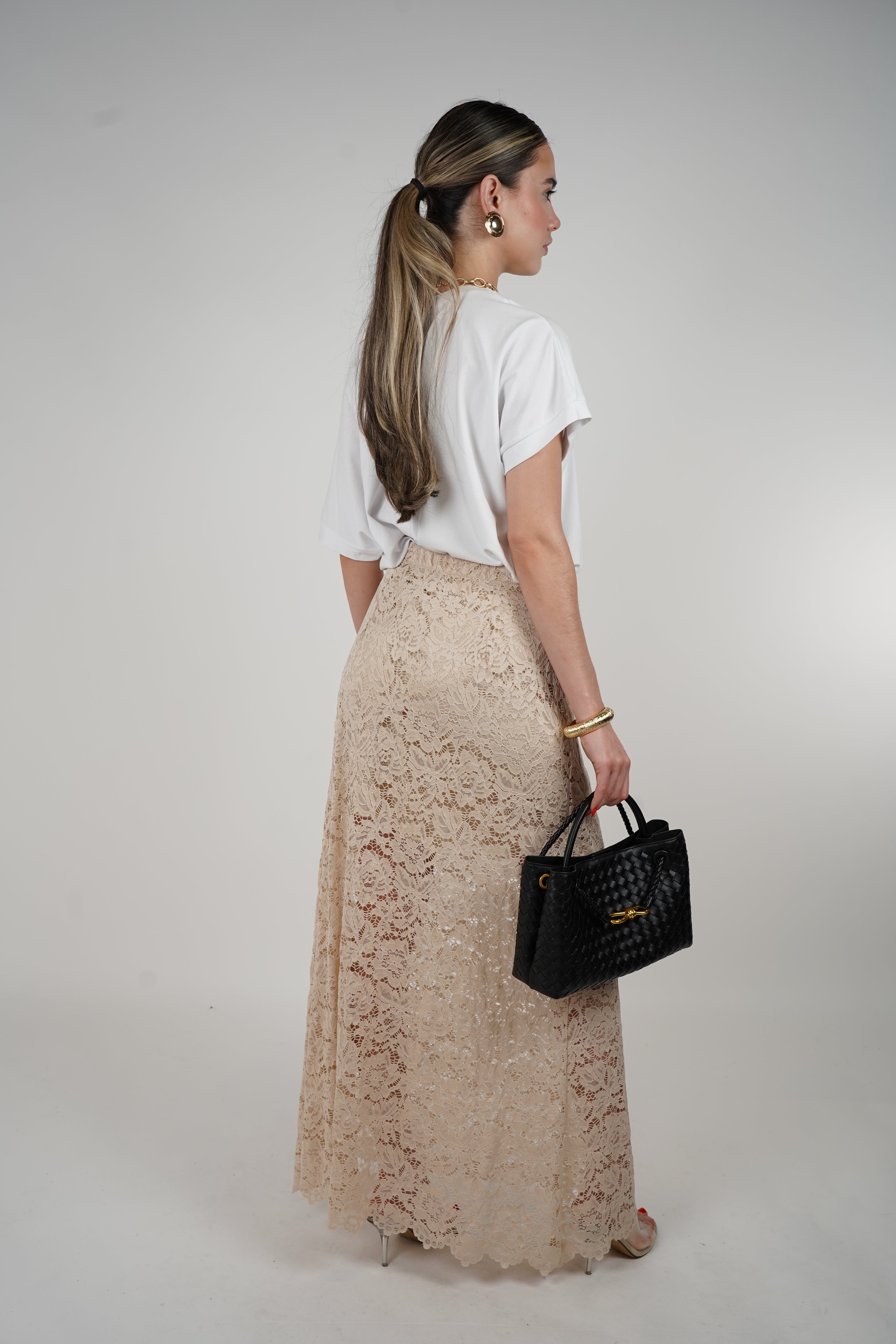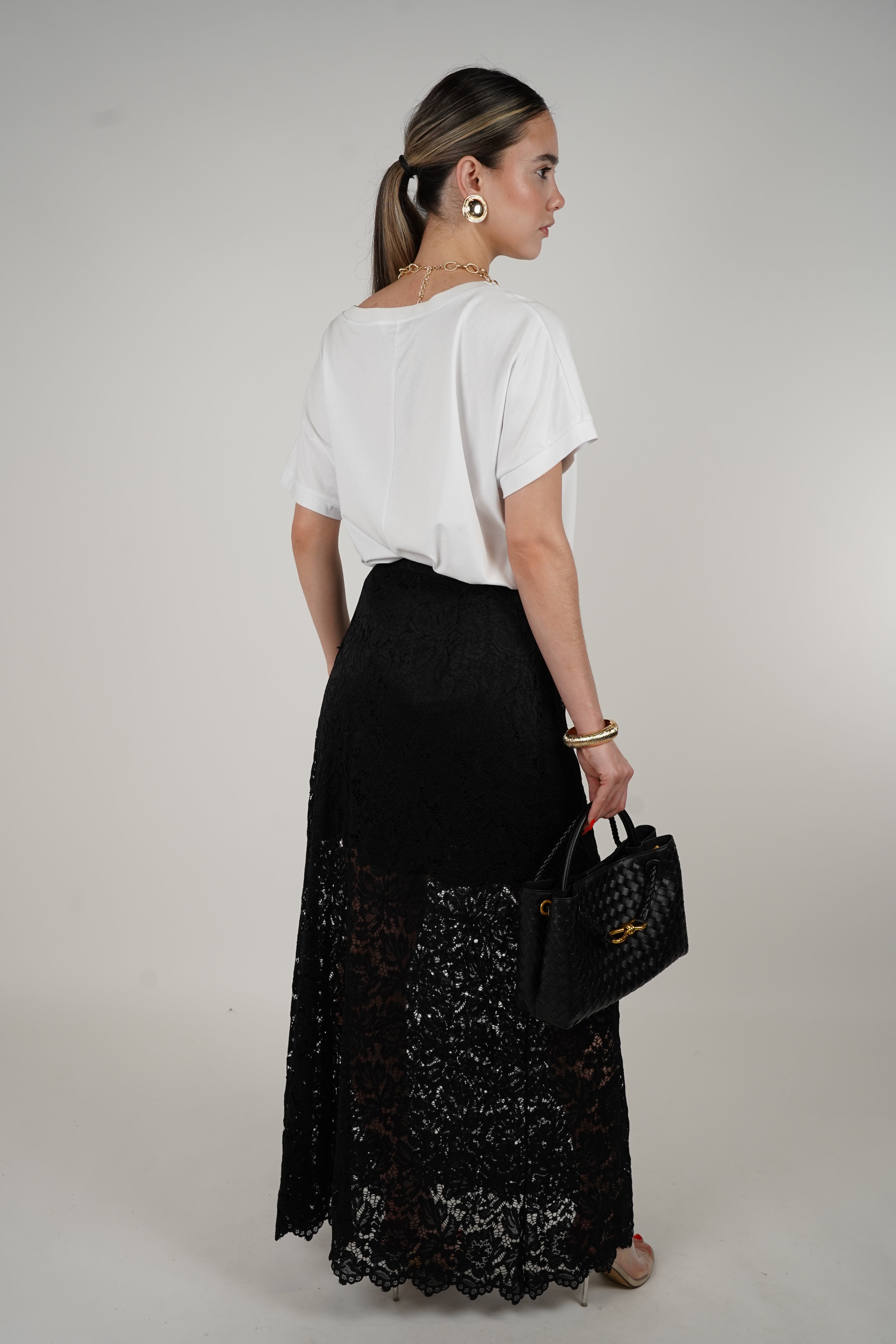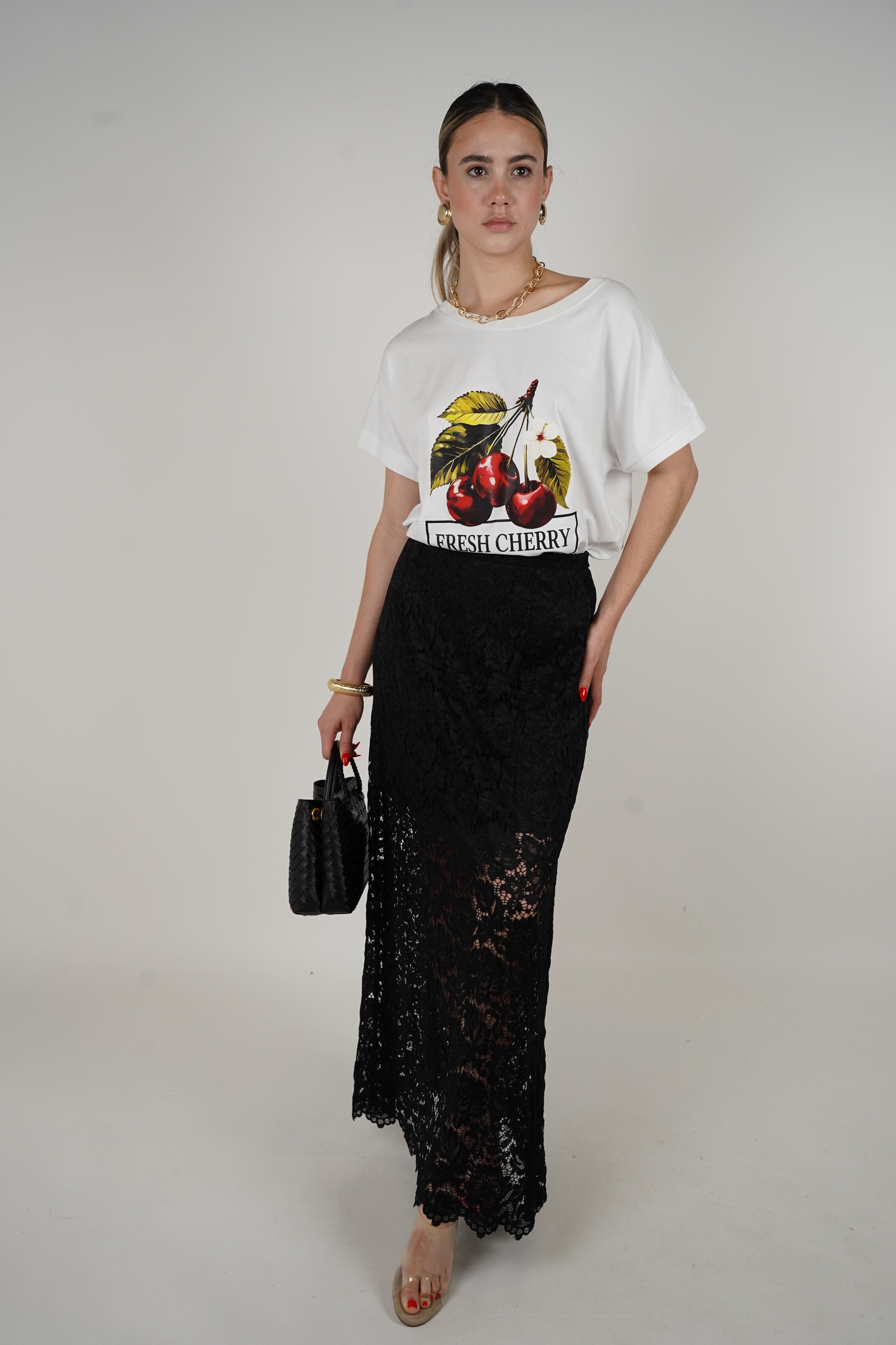 Model styles the Yeva Lace Skirt with a graphic tee, gold jewelry, a black textured handbag, and clear heels for a bold and chic outfit.