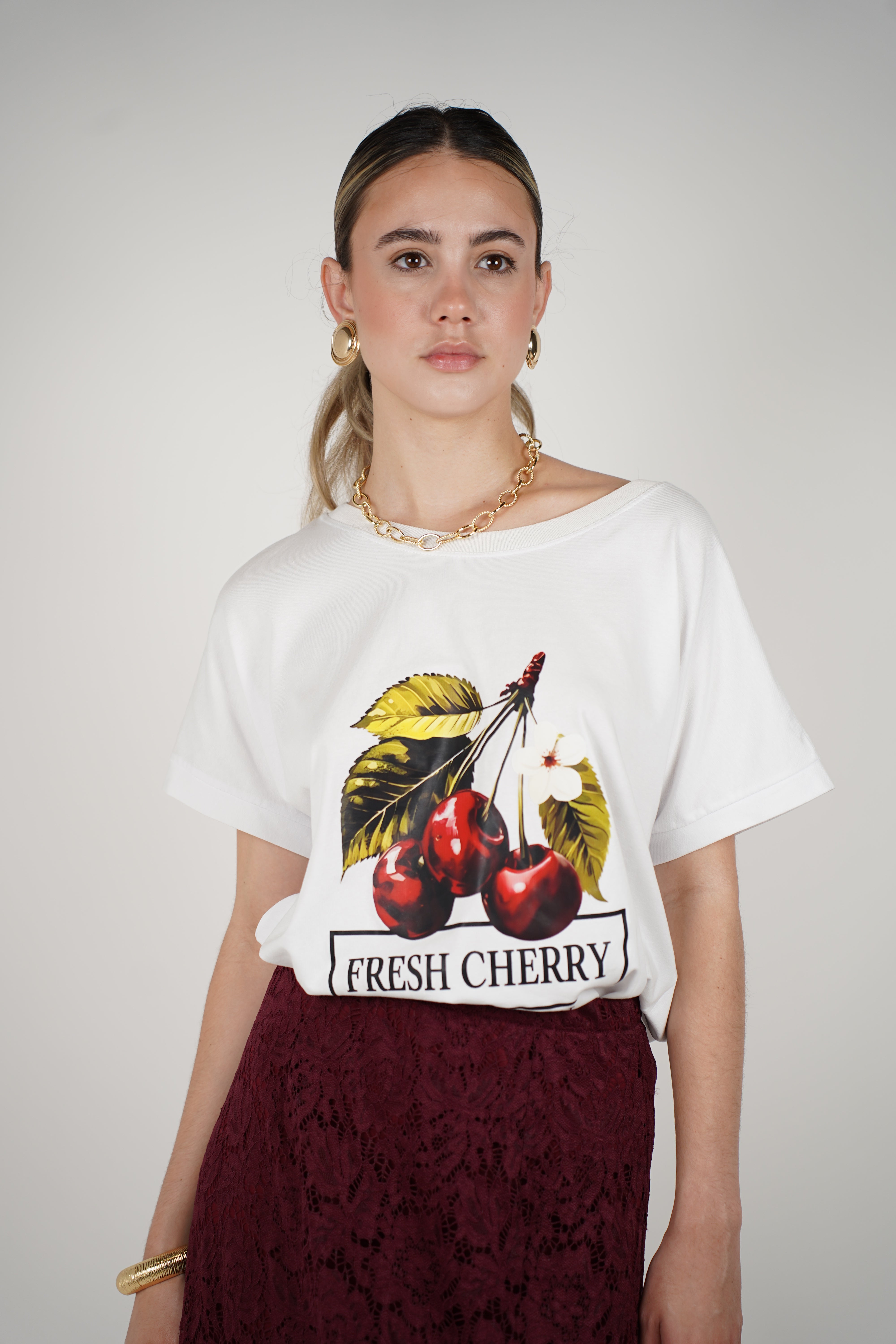 Model wearing burgundy Yeva Lace Skirt with white graphic tee and clear heels.