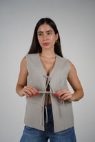 Title: Yuliet Vest – Tie-Front Beige Sleeveless Blazer