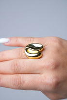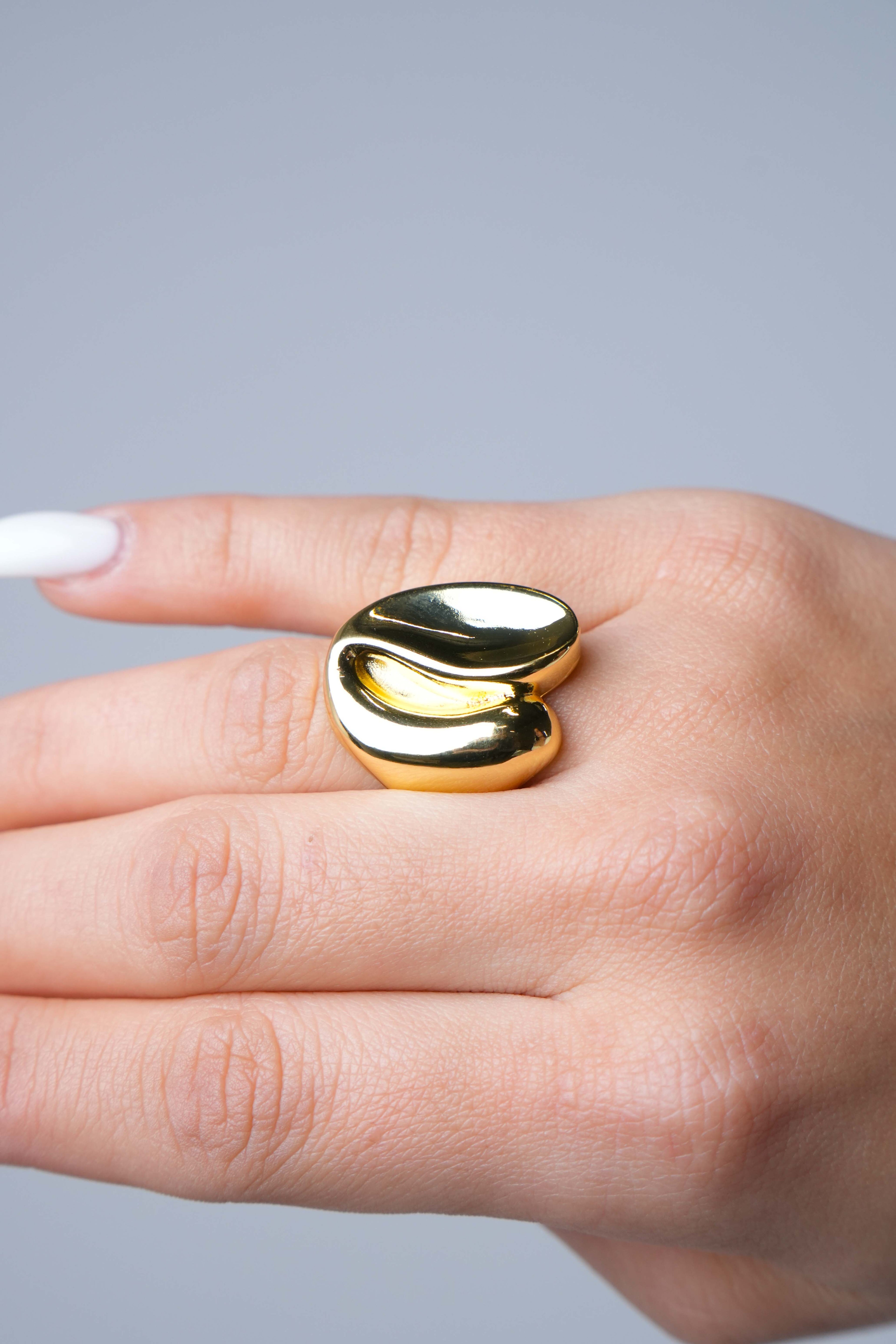 Gold chunky sculptural ring with a smooth polished finish worn on the hand against a neutral background.