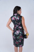 Sleeveless leather-look floral midi dress with a tailored waist and belt, worn with black heels and clutch on a model against a neutral background.