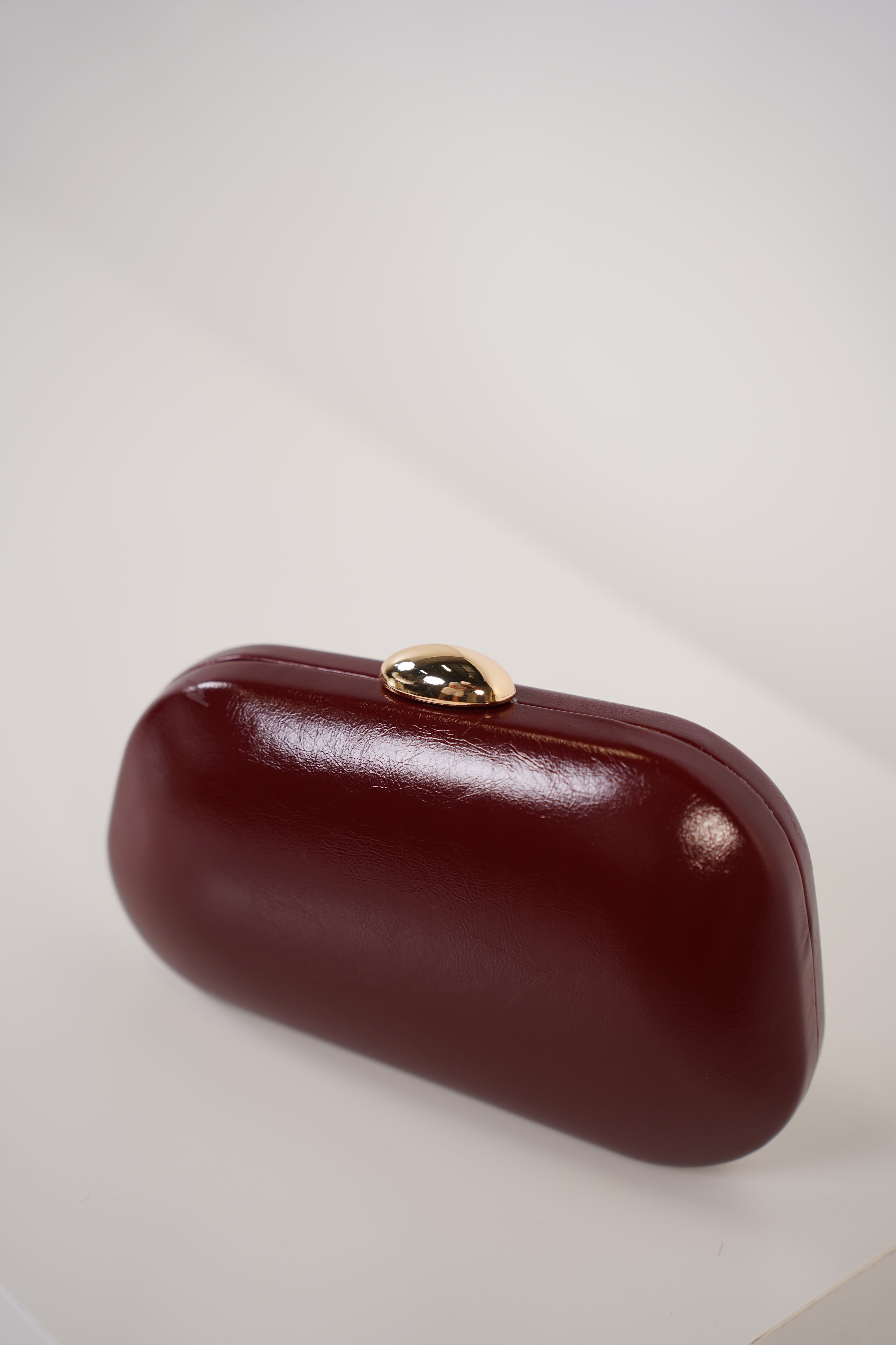 A sleek burgundy clutch with a smooth structured finish and polished gold clasp for an elevated, classic look.