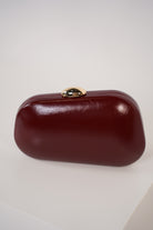 Shop the Ciana Clutch, a sleek burgundy structured bag featuring a polished gold dome clasp. Perfect for formal events, dinners, and elevated evening looks.