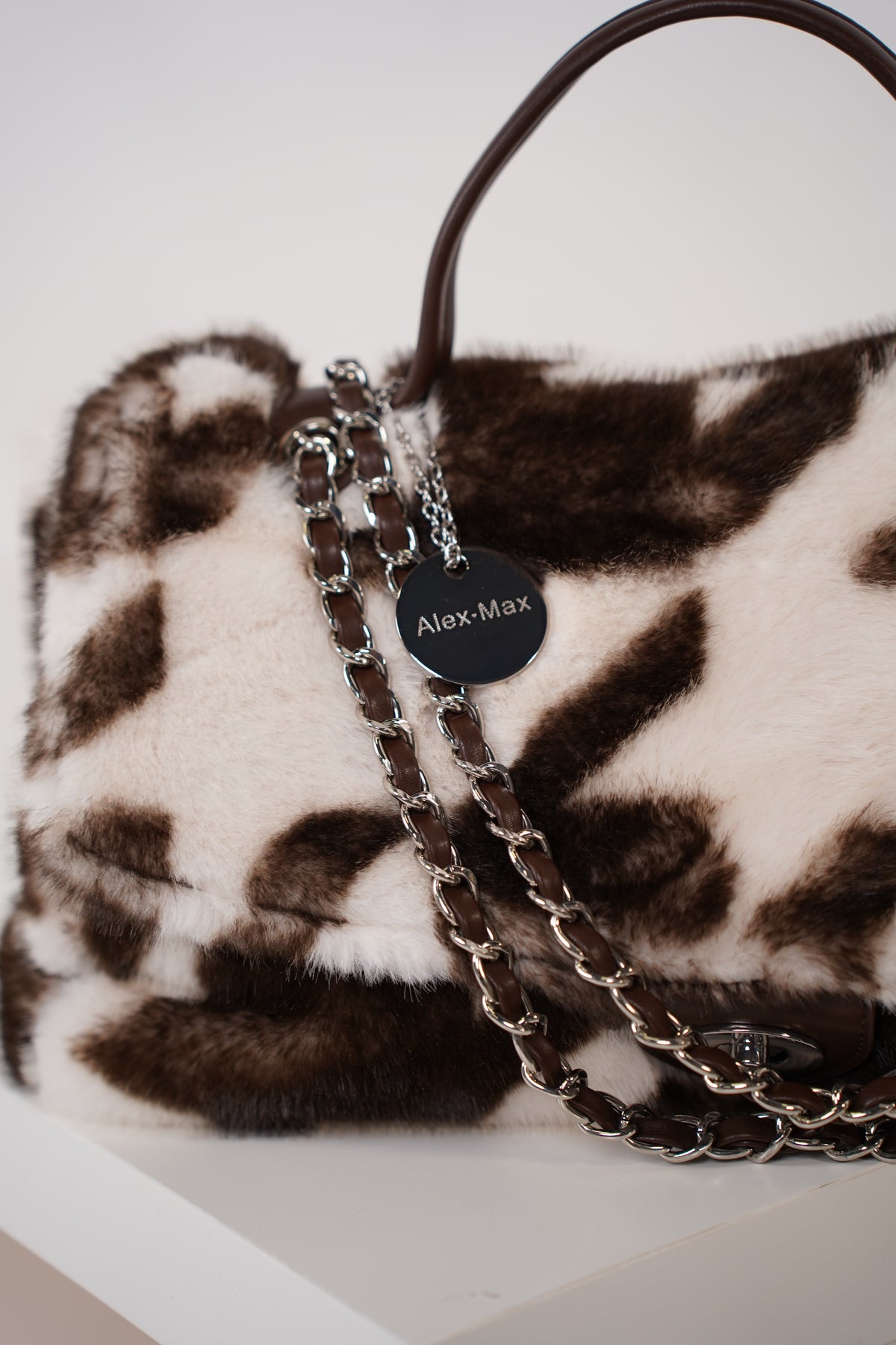 The Cava Tote Bag is your new cold-season statement piece. Featuring an ultra-soft faux-fur exterior with a striking brown-and-cream pattern, this tote delivers luxury and personality in one design. The structured top handle and double chain detail add a polished touch, balancing the cozy texture with elevated hardware. Its spacious interior makes it perfect for daily wear, travel, or adding a glamorous edge to any outfit. Stylish, warm-toned, and instantly eye-catching—this tote brings fashion and function together seamlessly.