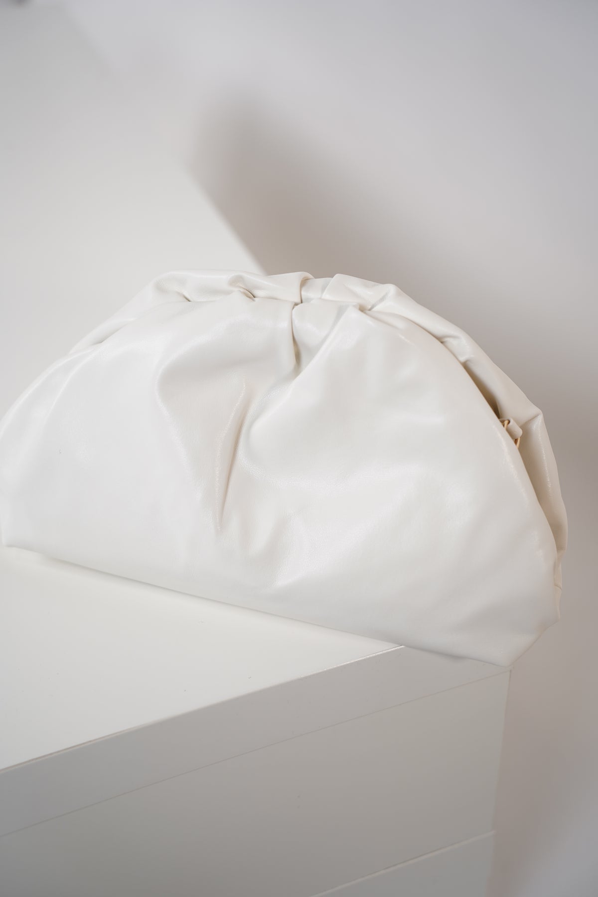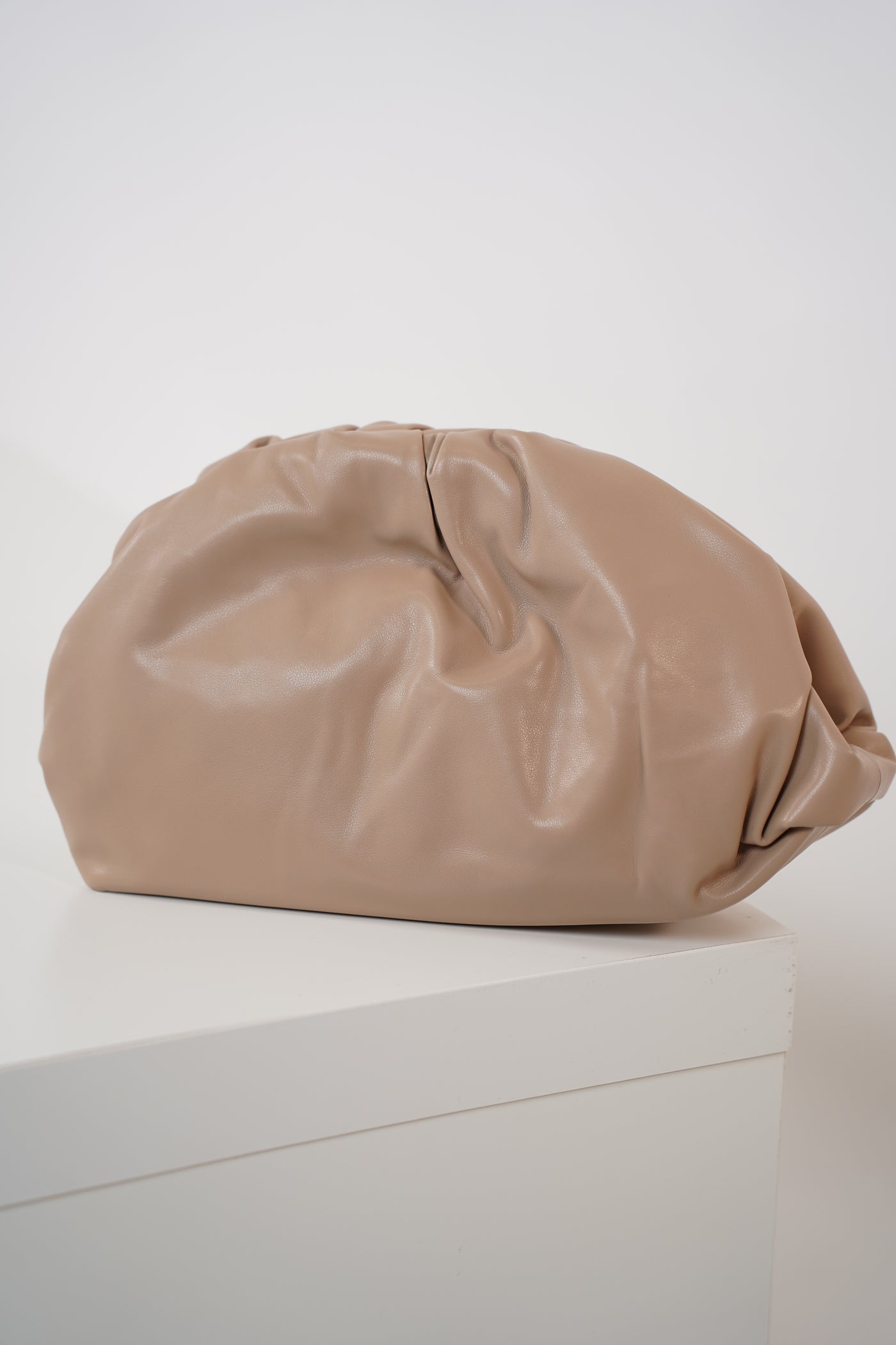 Shop the Maren Soft Leather Pouch Bag – a chic brown faux leather clutch with a gathered design. Versatile, spacious, and effortlessly elegant.