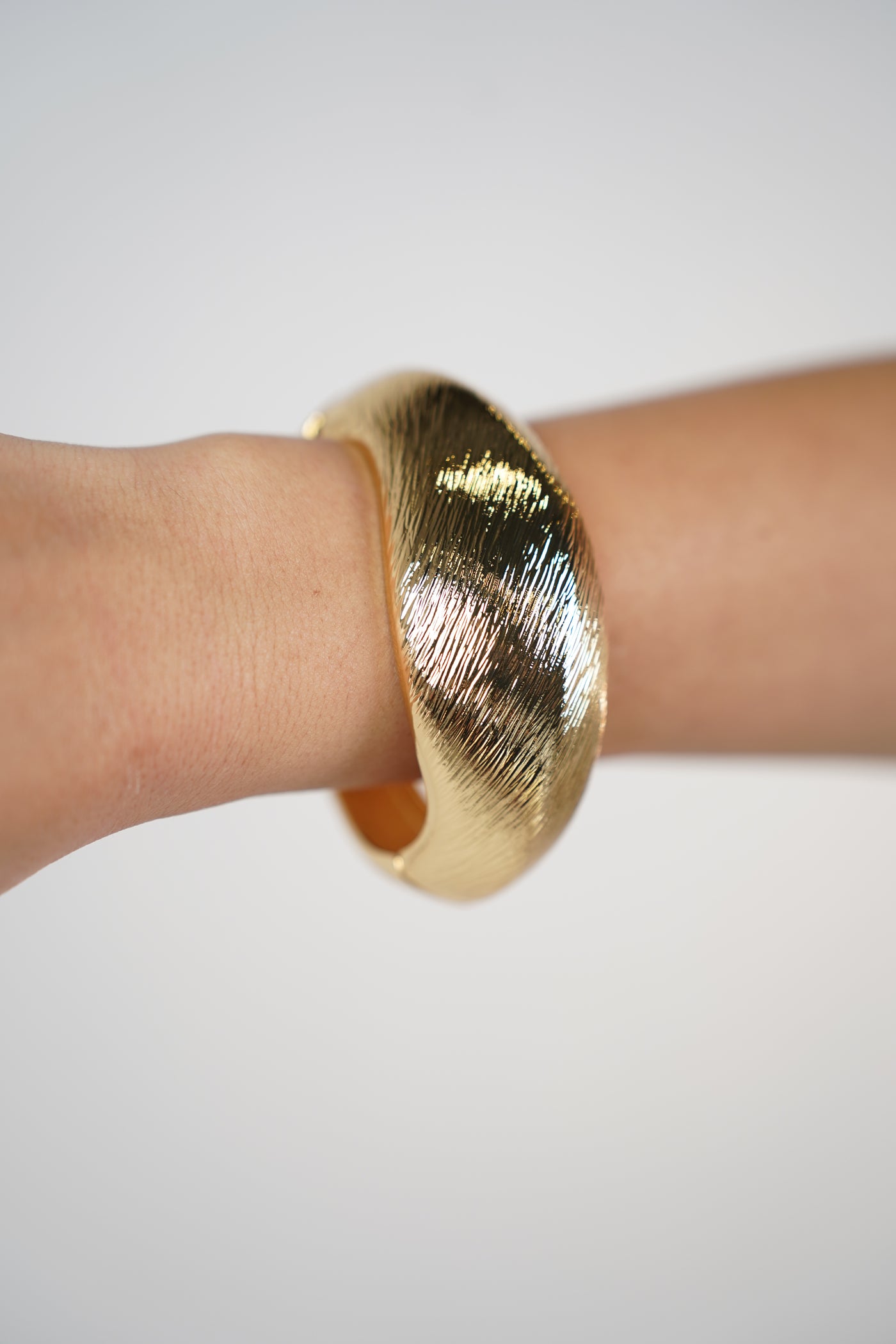 A sculptural oval bracelet cuff with a textured finish that adds dimension to any look.
