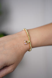 The Navi Cherry Bracelet is the perfect blend of whimsy and chic. Designed with polished gold beads and a playful cherry charm encrusted in pink crystals, this bracelet adds a fresh and fun accent to any outfit. Whether worn solo or stacked with others, it brings a subtle pop of color and personality to your jewelry collection. Lightweight and stretchy, it slips on easily for all-day comfort.