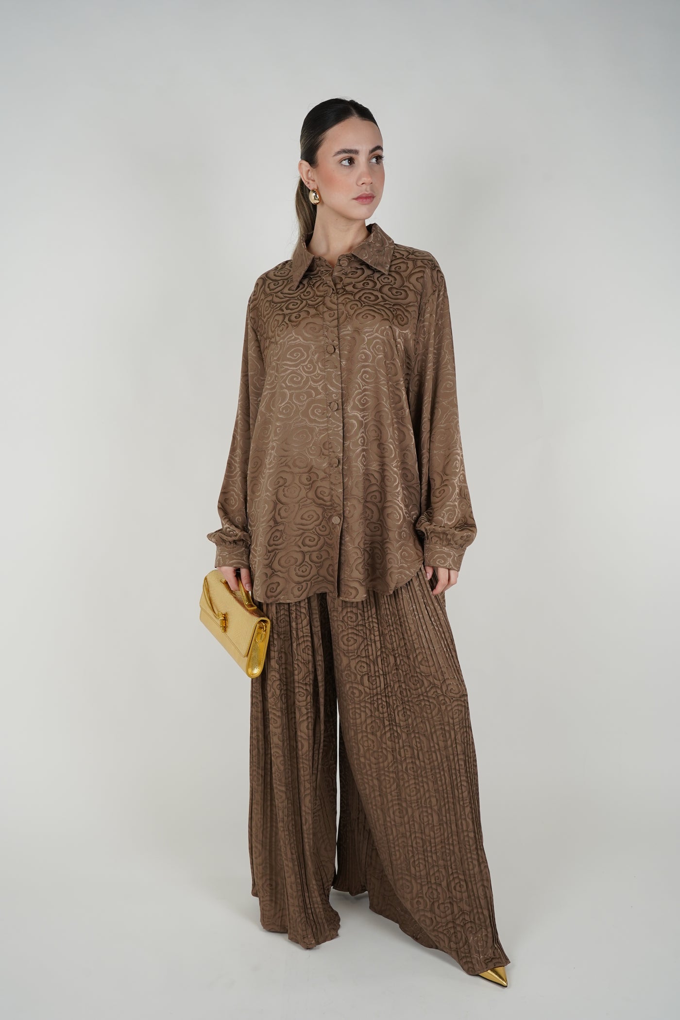 A coordinated pants set featuring a flowy button-down top and wide-leg pleated pants with an all-over textured pattern for an elevated, effortless look.