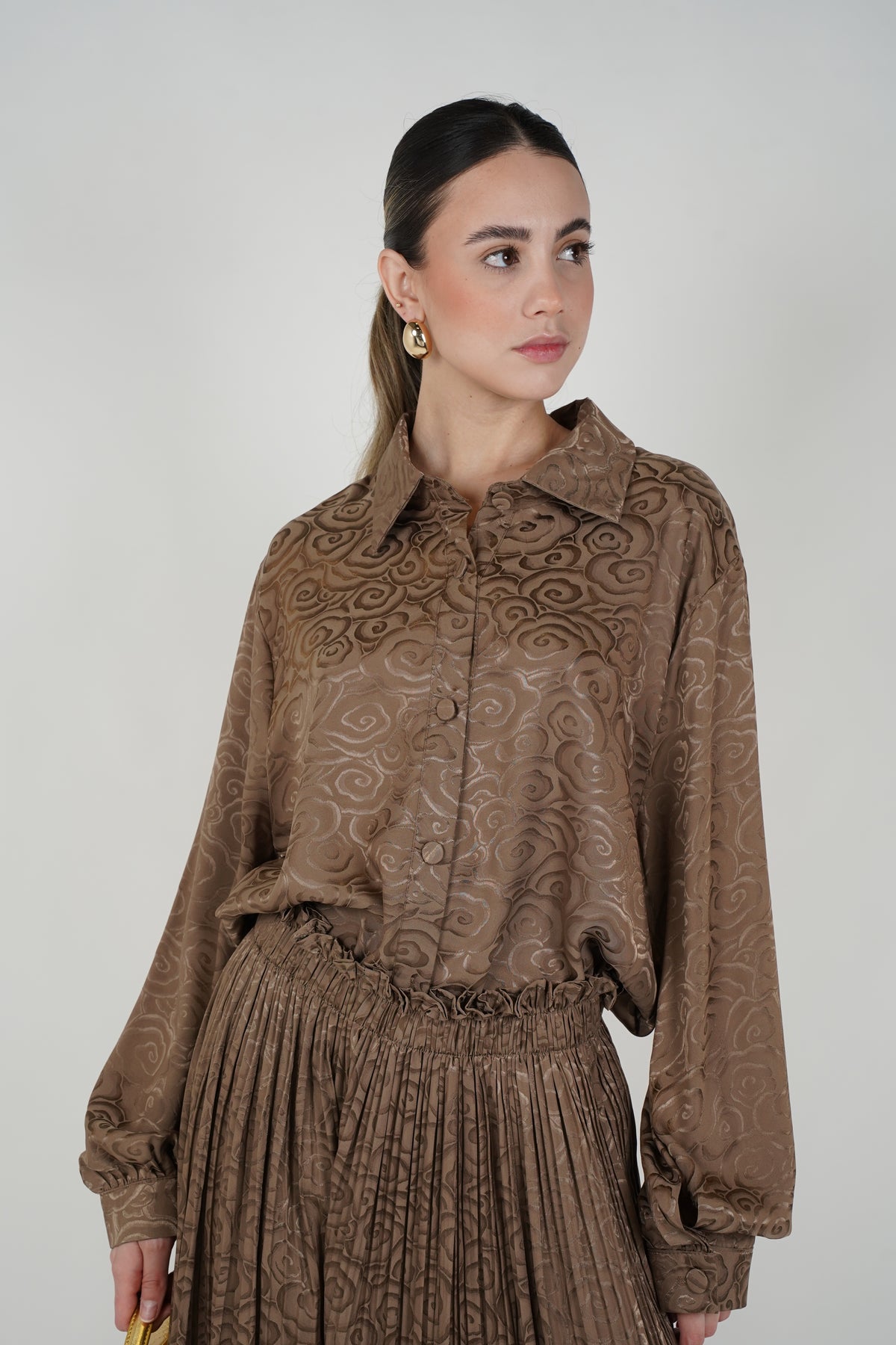 Details Color: Brown Pattern: Textured swirl pattern Fit: Relaxed Length: Full length pants Sleeves: Long sleeves Neckline: Collared neckline Waistband: Not visible Closure: Front button closure (top) Pockets: Not visible Stretch: Not visible Material: To be confirmed Care: To be confirmed