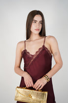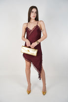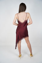“Woman wearing burgundy satin lace asymmetrical mini dress”