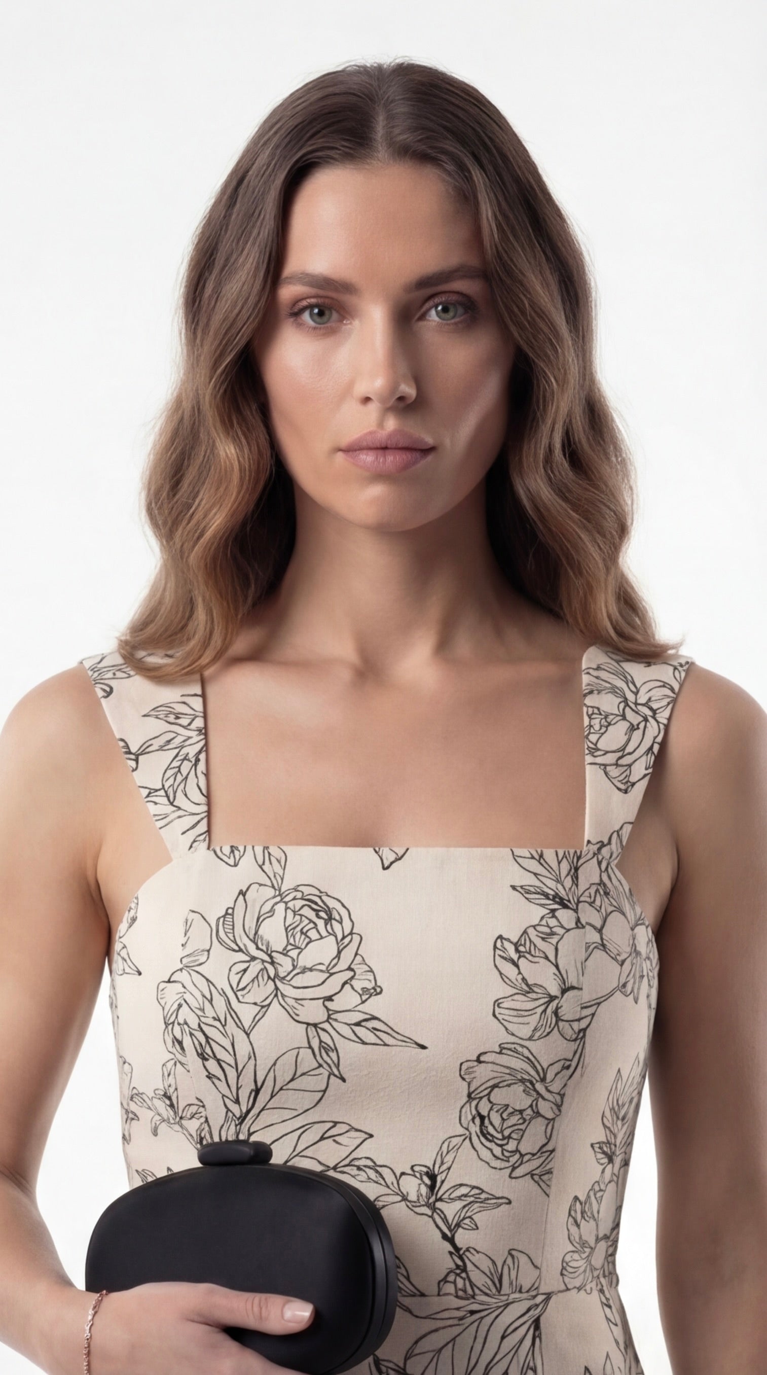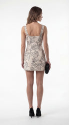 Model wearing ivory floral jacquard mini dress with square neckline, wide straps, and tailored fit.