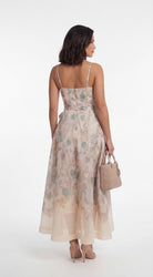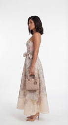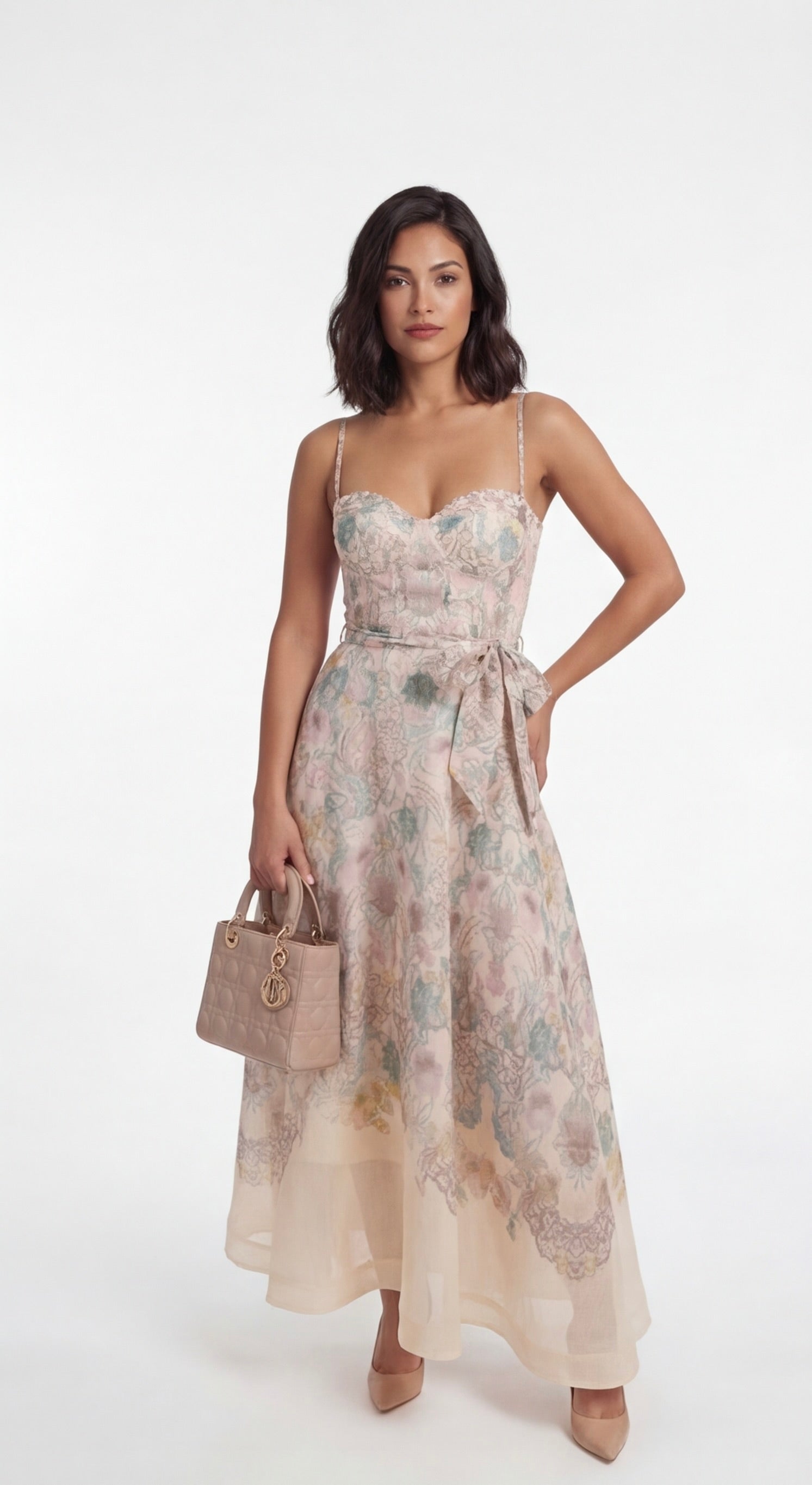 Pastel floral sweetheart neckline maxi dress with flowing skirt and side waist tie detail styled with nude mini handbag.