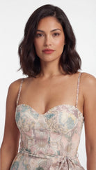 Elegant pastel floral maxi dress with sweetheart neckline, structured bodice and flowing skirt. Perfect for weddings, events and special occasions.