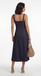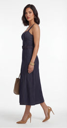 A structured denim midi dress with contoured bodice and waist belt. The Virey is a timeless, flattering investment for elevated everyday style.