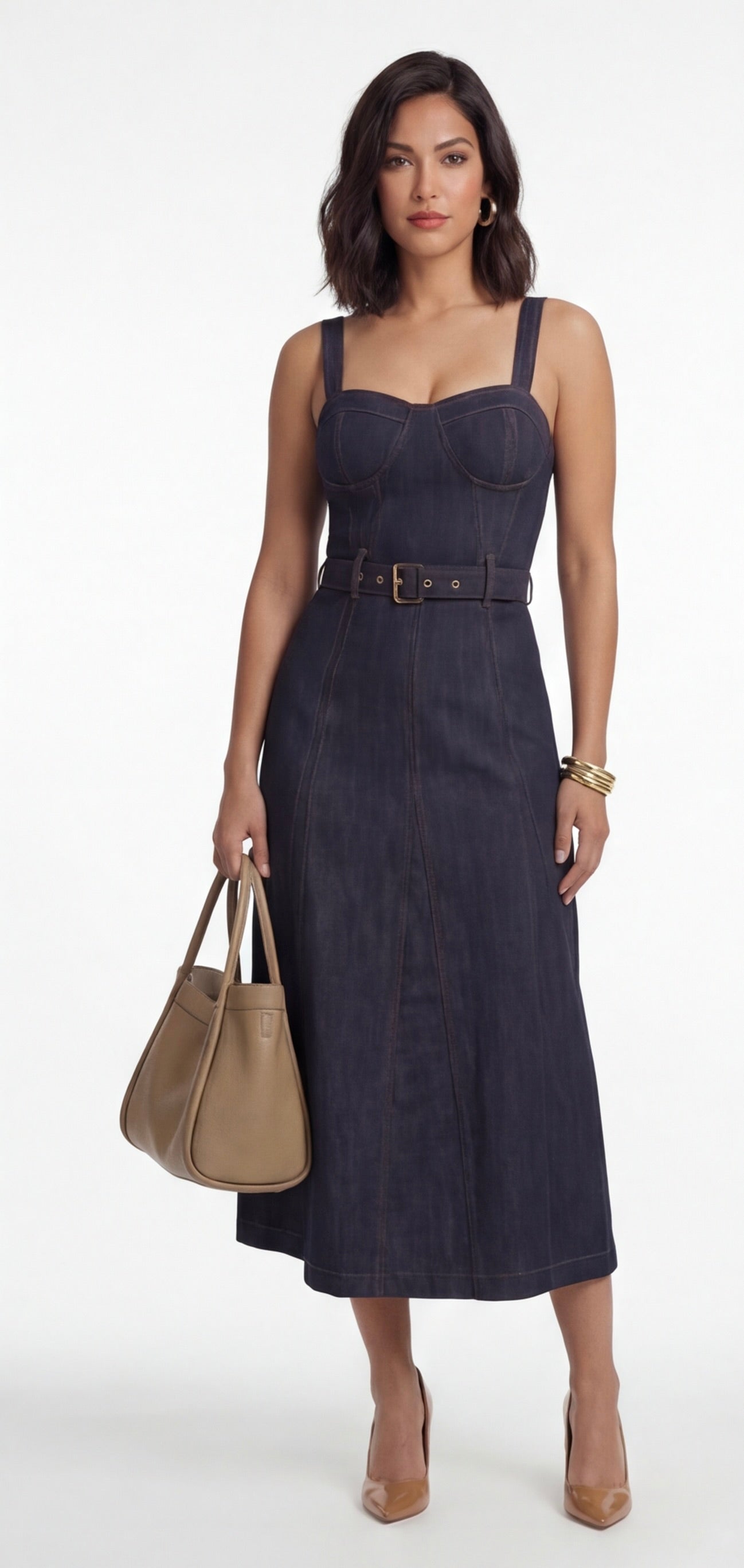 Model wearing dark denim midi dress with wide straps, fitted bodice, waist belt, and flared skirt styled with heels.