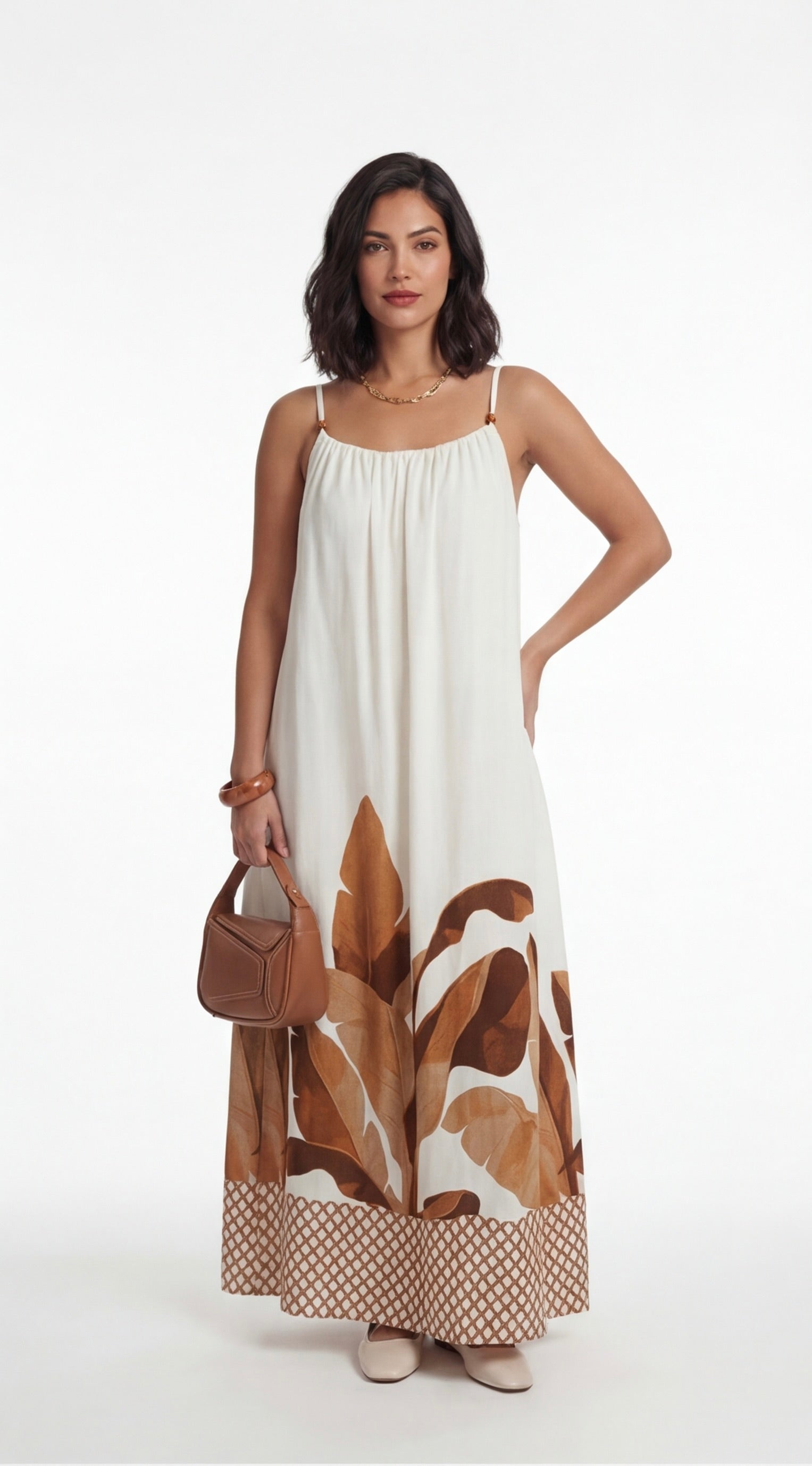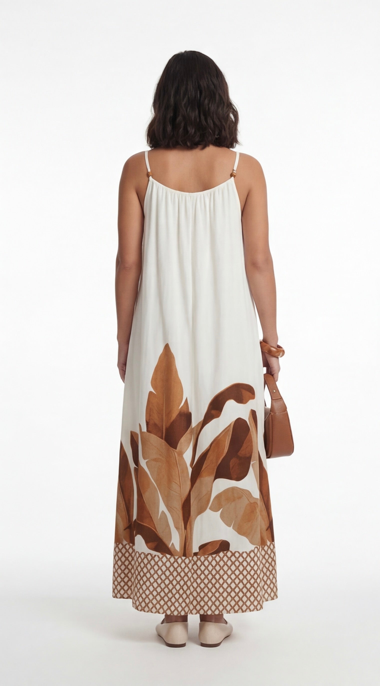 Model wearing brown maxi dress with light blue botanical print, strappy shoulders, and relaxed flowing silhouette.