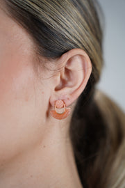 Close-up of model wearing peach-toned mini earrings with a half-moon shape and gold detailing.
