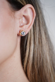 The Corya Mini Flower Earrings bring a touch of elegance to your everyday look. Designed with a round-cut crystal center framed by a delicate floral outline of gold and pavé accents, these earrings capture the perfect blend of charm and sophistication.