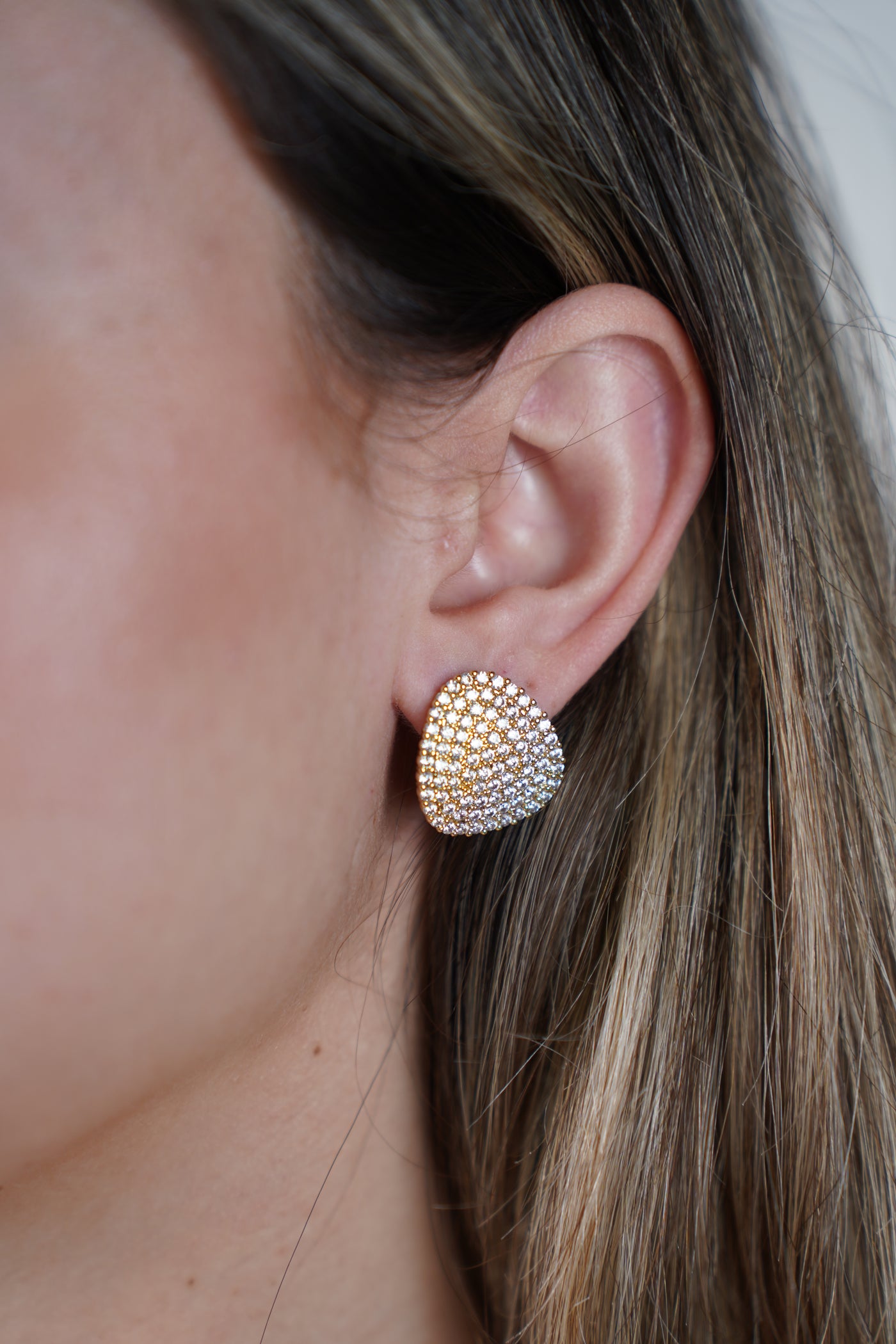 The Lunai Diamond Plaque Earrings bring instant radiance to your look with their bold, triangular silhouette and a full pavé of sparkling crystals. Crafted with a golden base that enhances the brilliance of each stone, these earrings offer a modern touch of luxury that complements both casual chic and evening glam.
