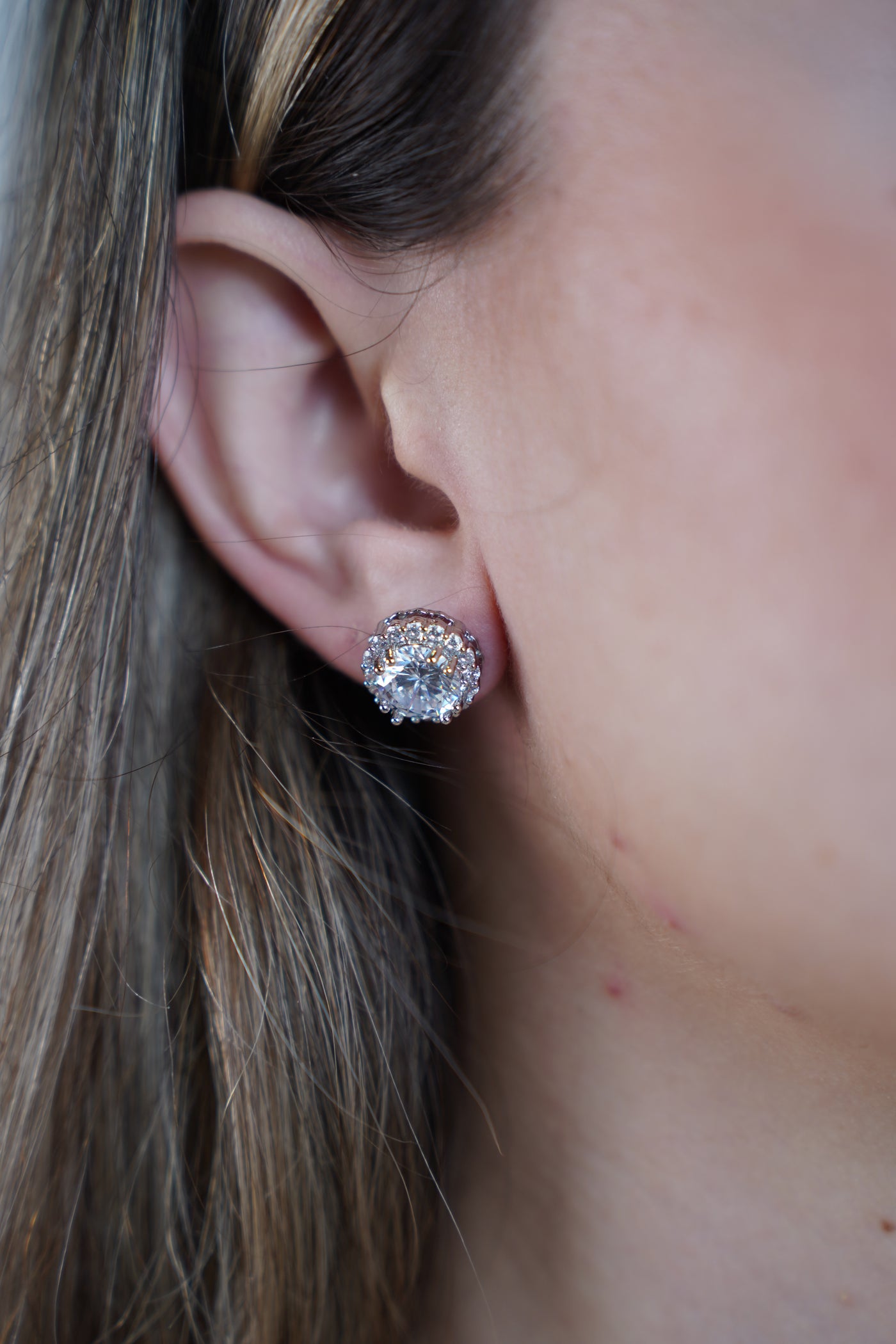 Oviah Diamond Earrings – round halo stud earrings with clear crystals on model’s ear