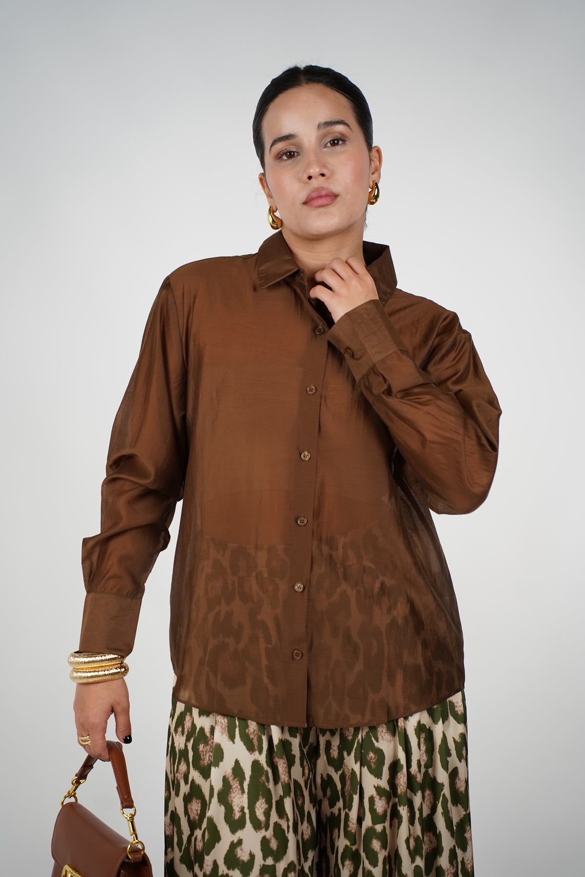 A lightweight, semi-sheer oversized blouse in a warm mocha tone—perfect for elevated layering.