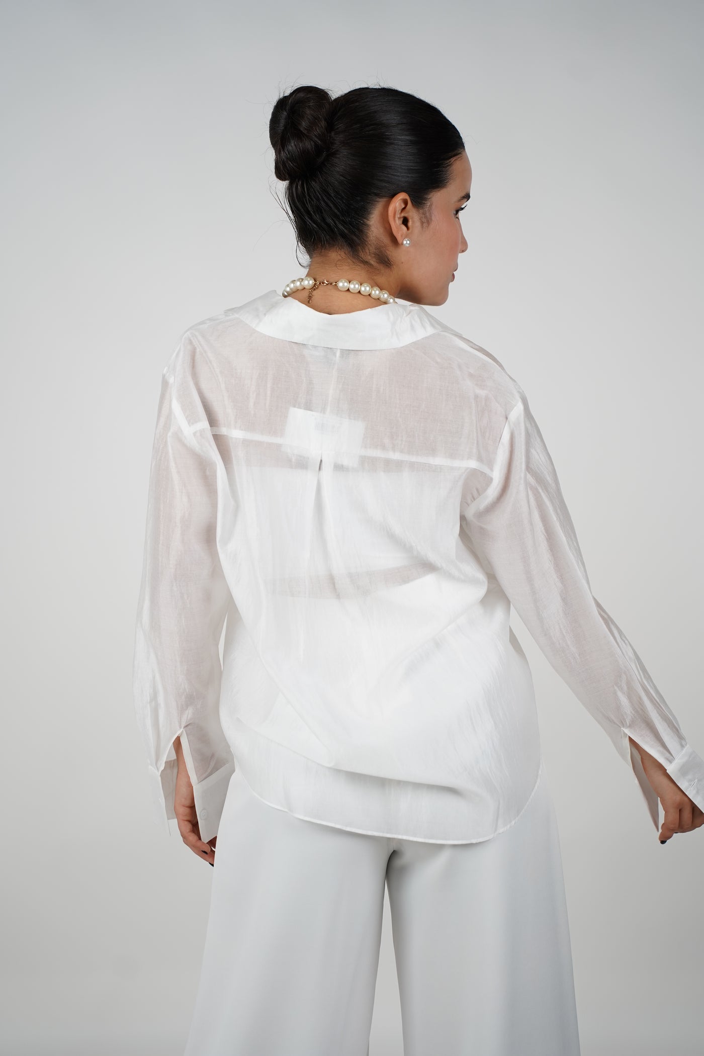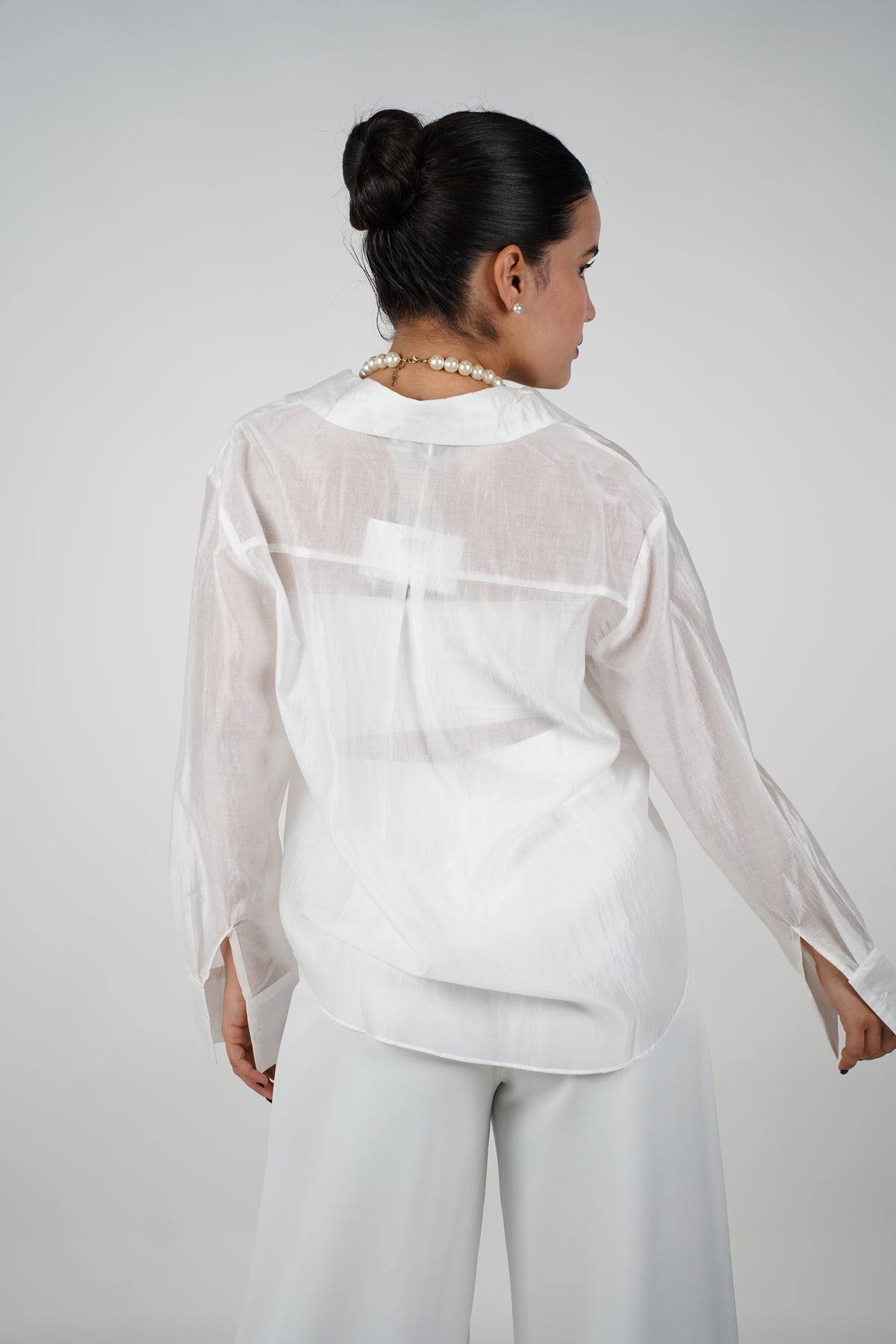 Model is 5'7", wearing the Davi Oversized Button Down with white wide-leg trousers and minimal gold jewelry. Fabric is sheer; styling with a neutral or matching undergarment recommended.