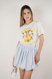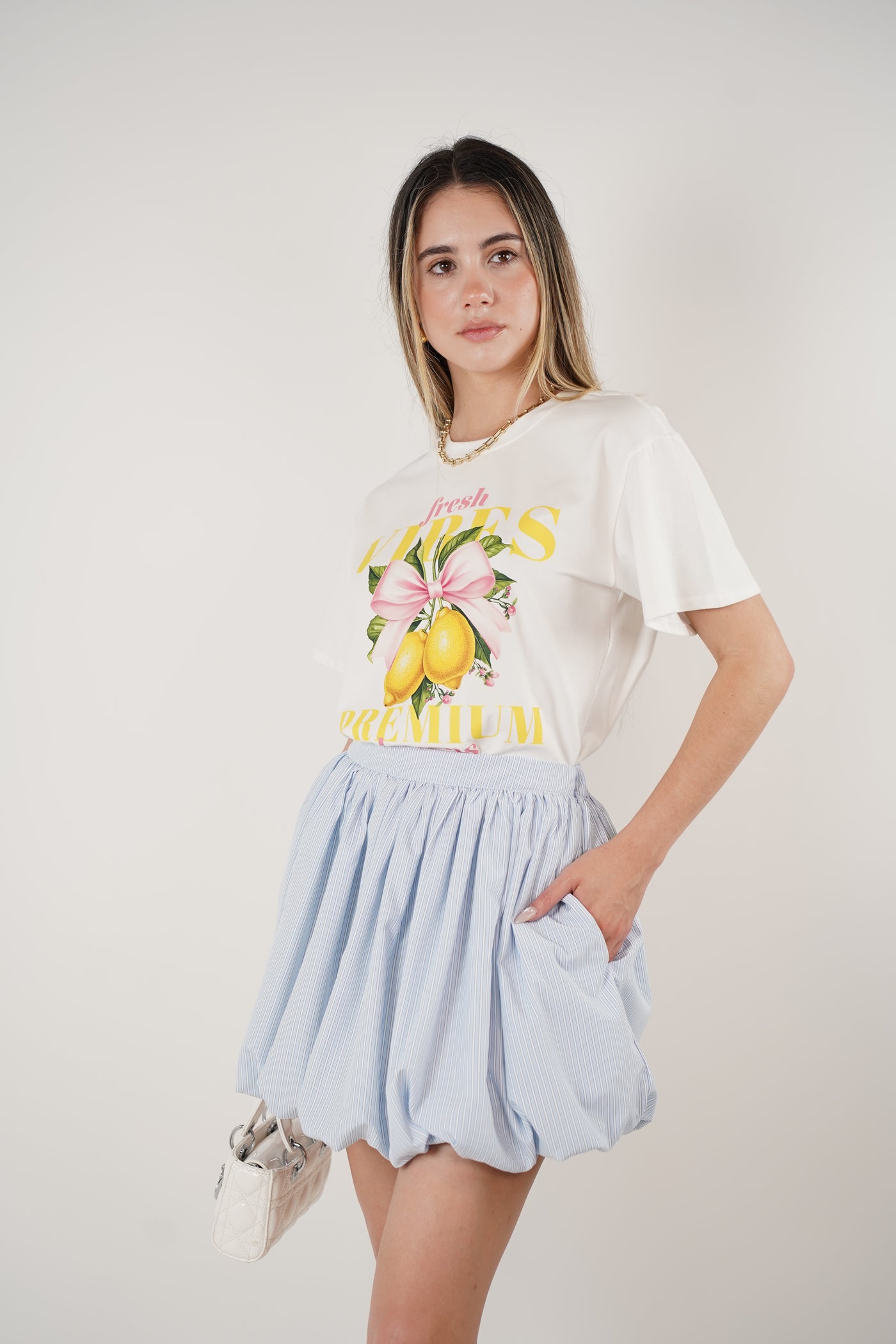 Meta Description: Shop the Elvar Bubble Mini Skirt in soft blue stripes. Featuring a playful balloon hem, elastic waist, and side pockets. A must-have seasonal favorite.