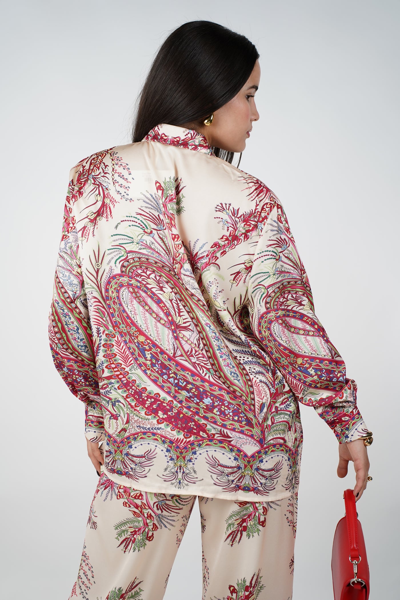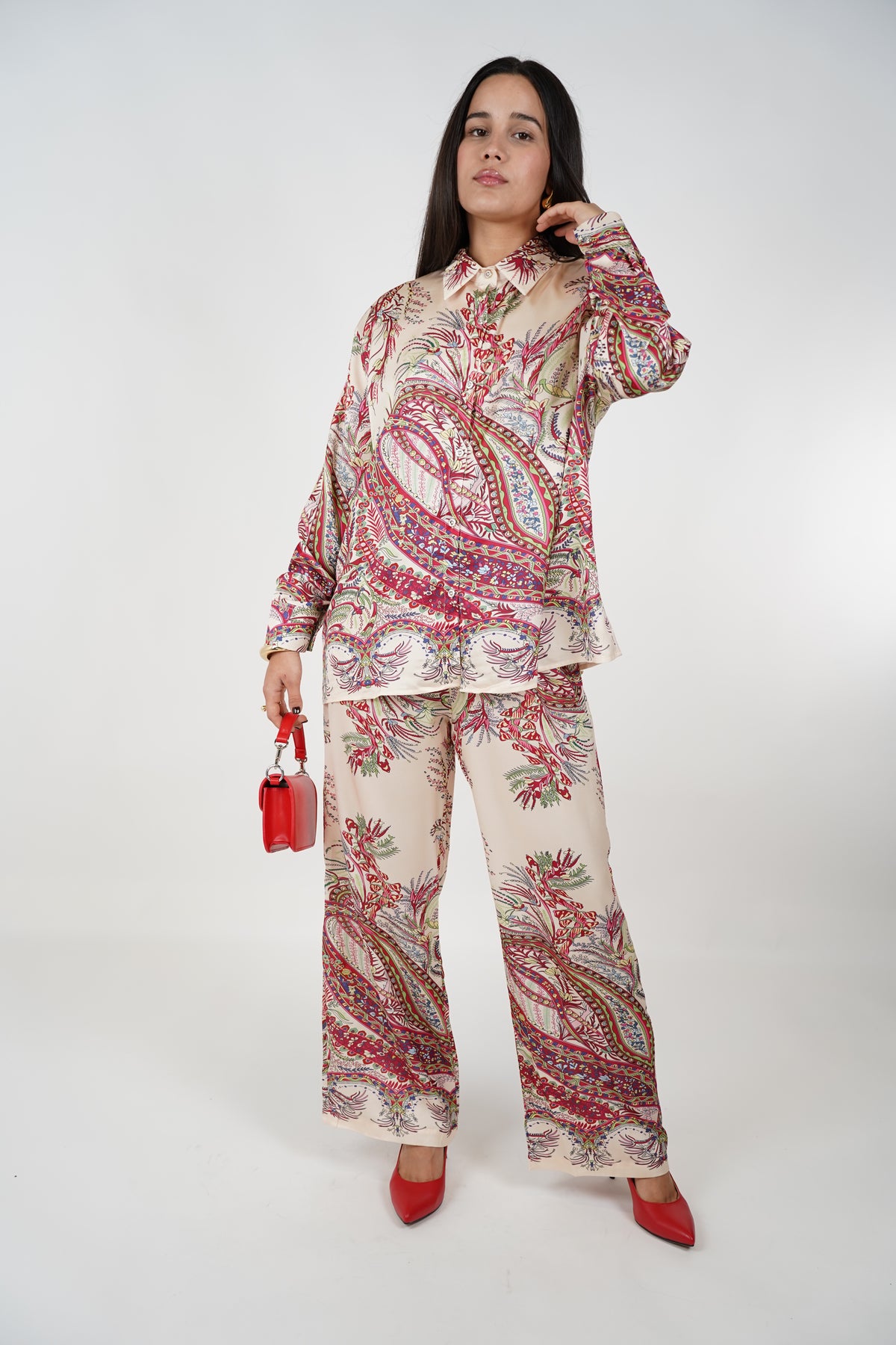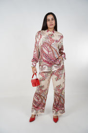Woman wearing satin floral paisley print pants set with button-down top and wide-leg pants.