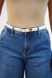 Close-up of thin white belt with gold buckle styled on blue high-rise denim.