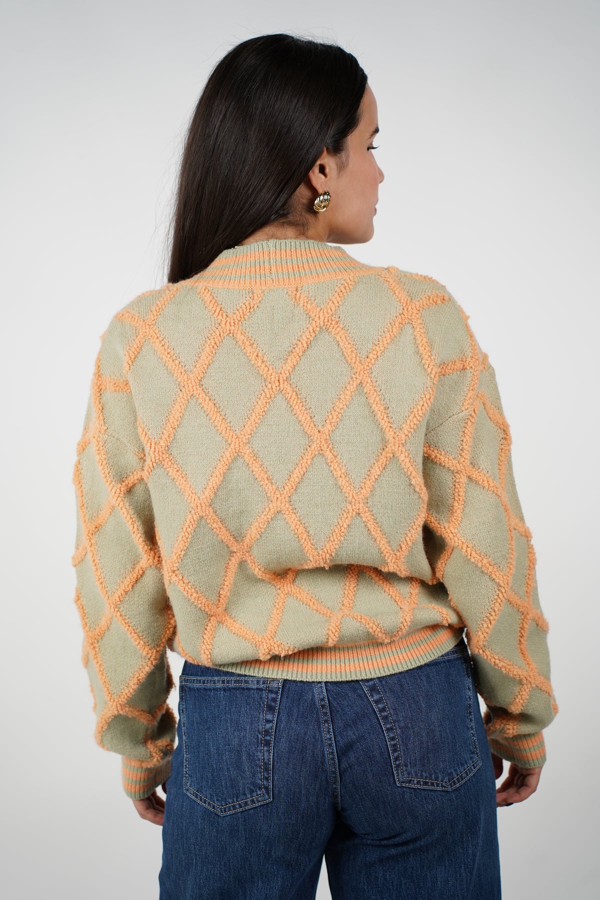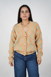 Woman wearing sage and peach diamond-pattern knit cardigan with buttons.