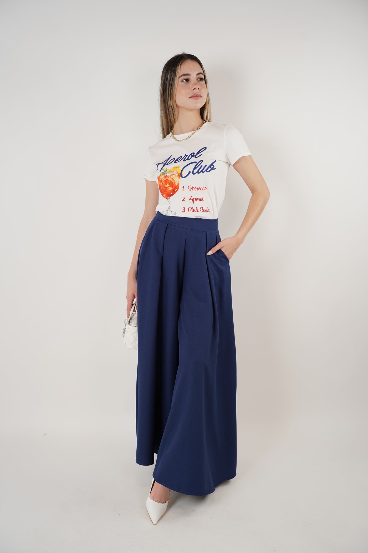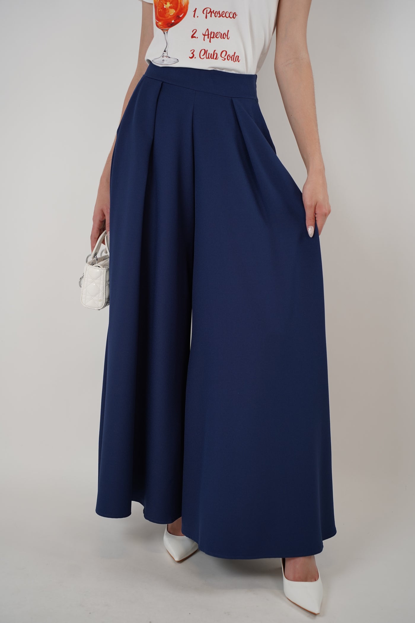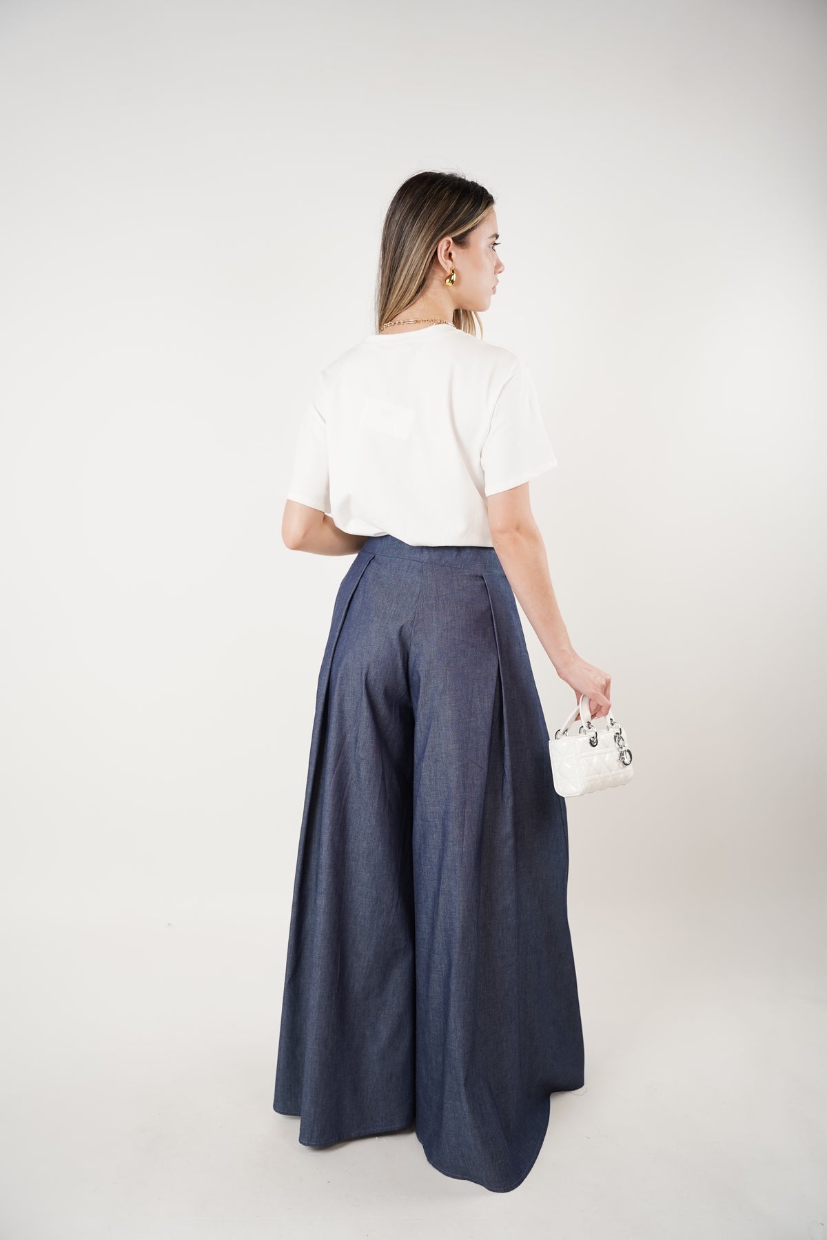 A stunning pair of high-waisted palazzo pants in rich dark denim with elegant volume and tailored details.