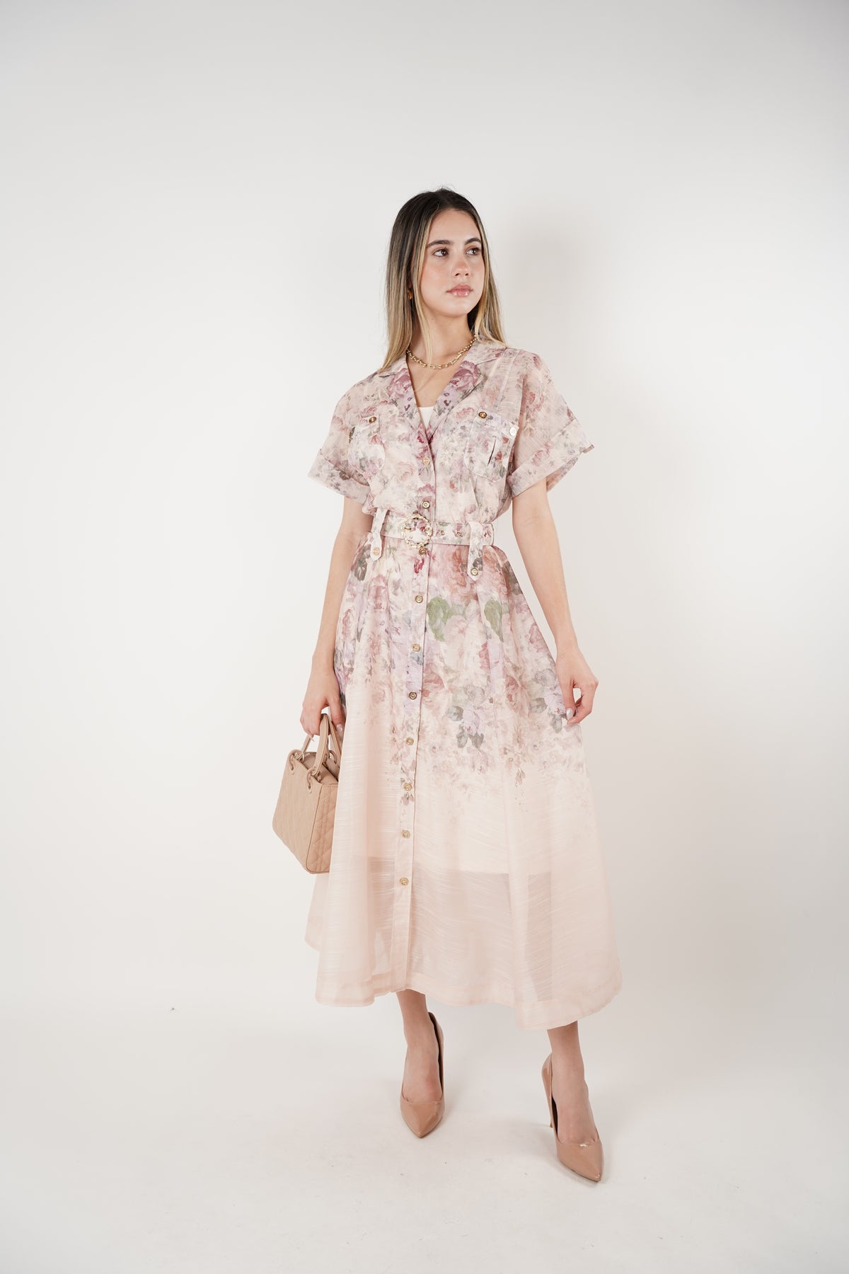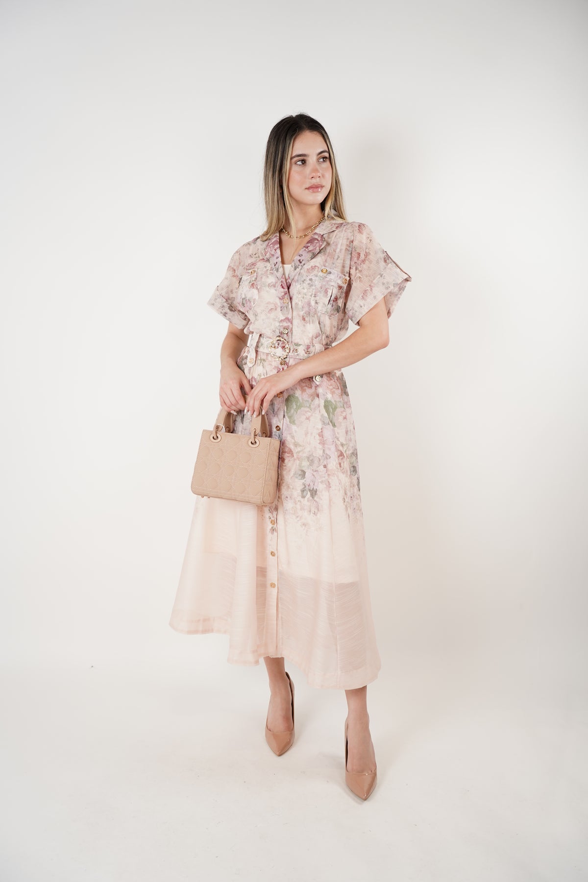 Model wearing a blush floral maxi button-down dress with belt and heels, holding a nude handbag.
