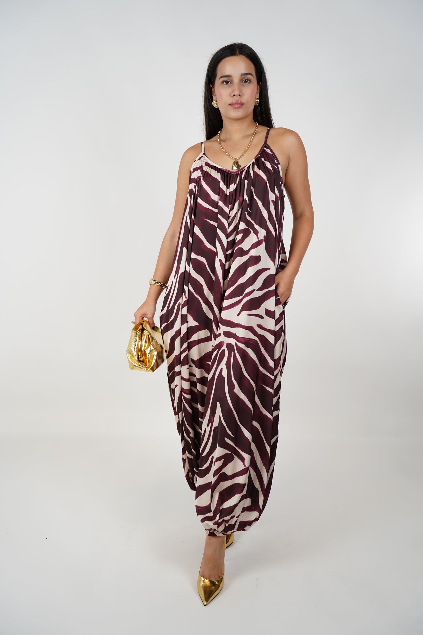 A flowy zebra-print jumpsuit with jogger-style hems for a modern, statement-making look.