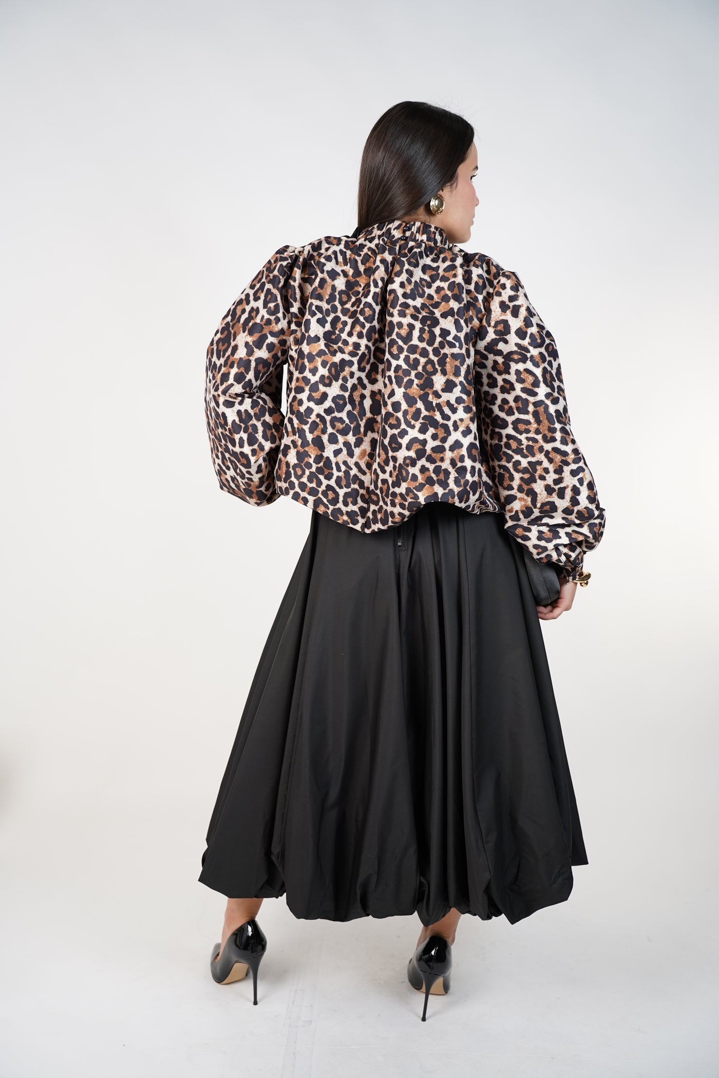 Seraphy Leopard Bubble Top with bow neckline and voluminous silhouette in brown and black leopard print