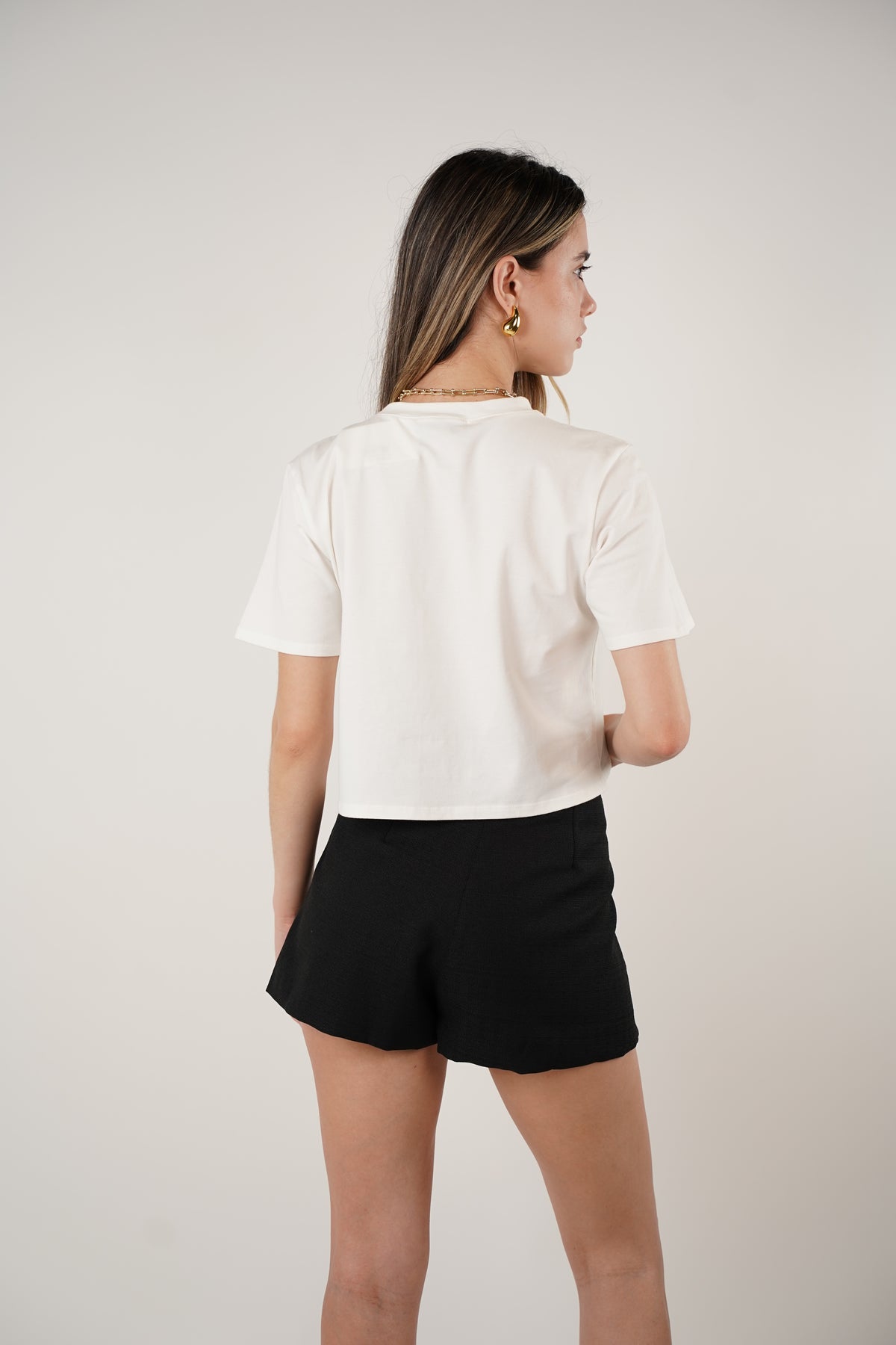 Model is 5'5" and wears it tucked into black flowy shorts with minimal accessories. Tee is lightweight and pairs effortlessly with high-rise bottoms.