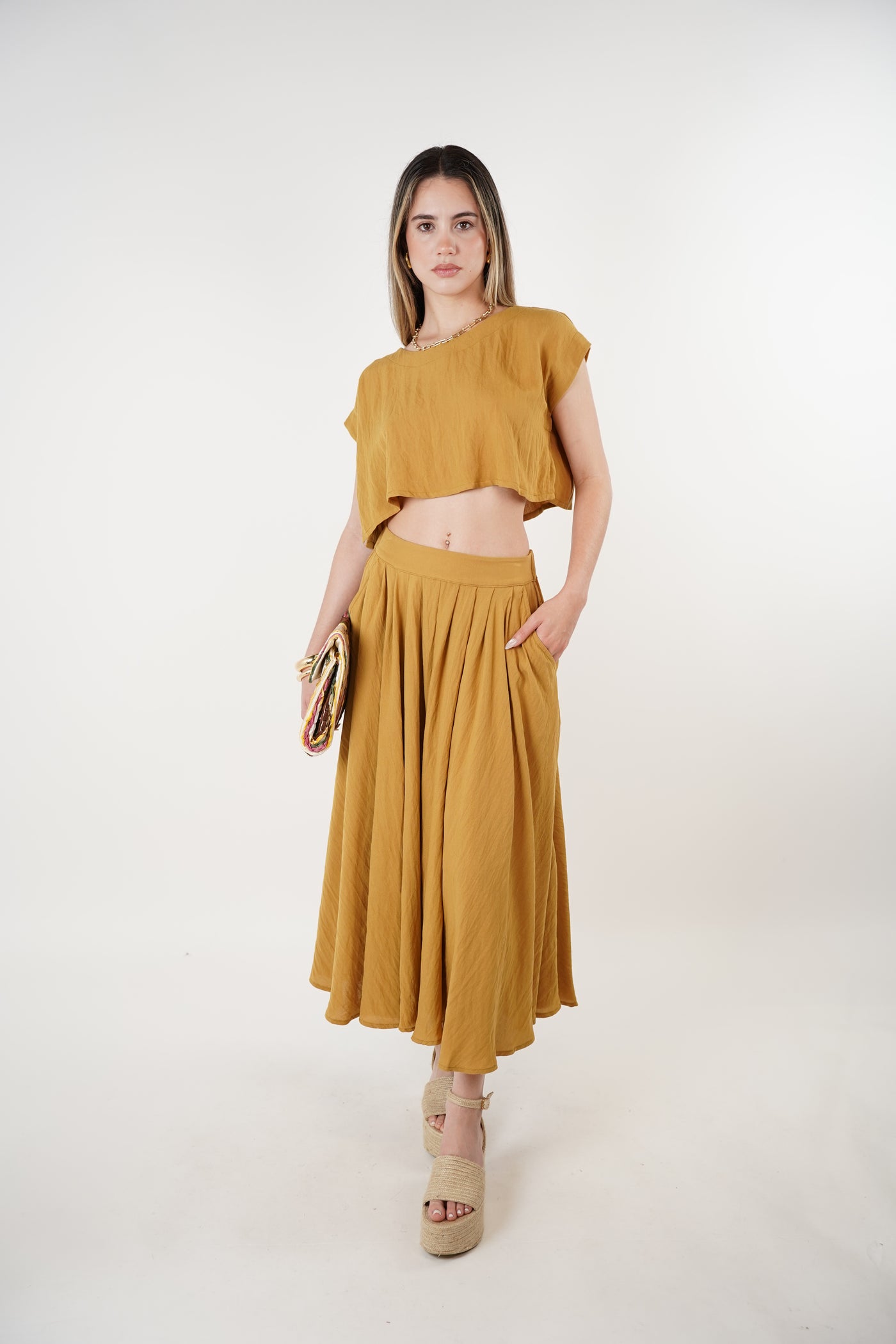 Yavi Skirt Set – Mustard Two-Piece with Flowing Skirt and Cropped Top