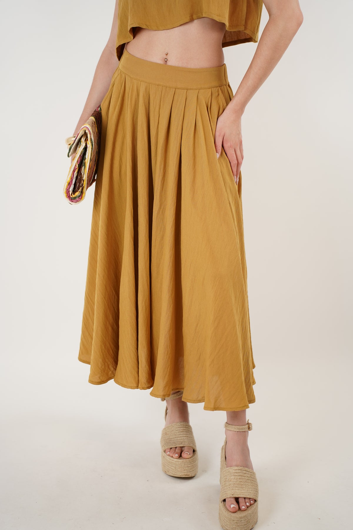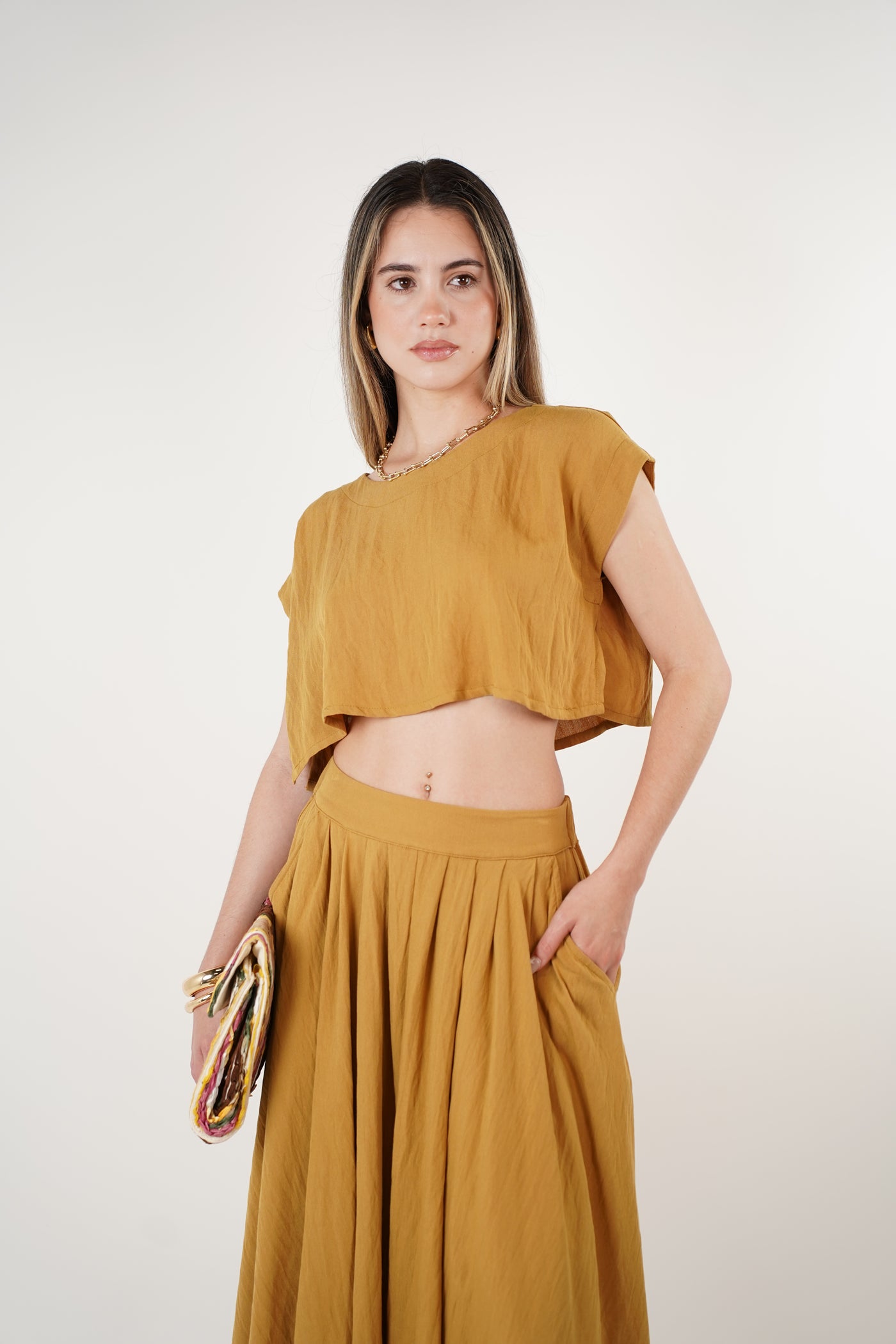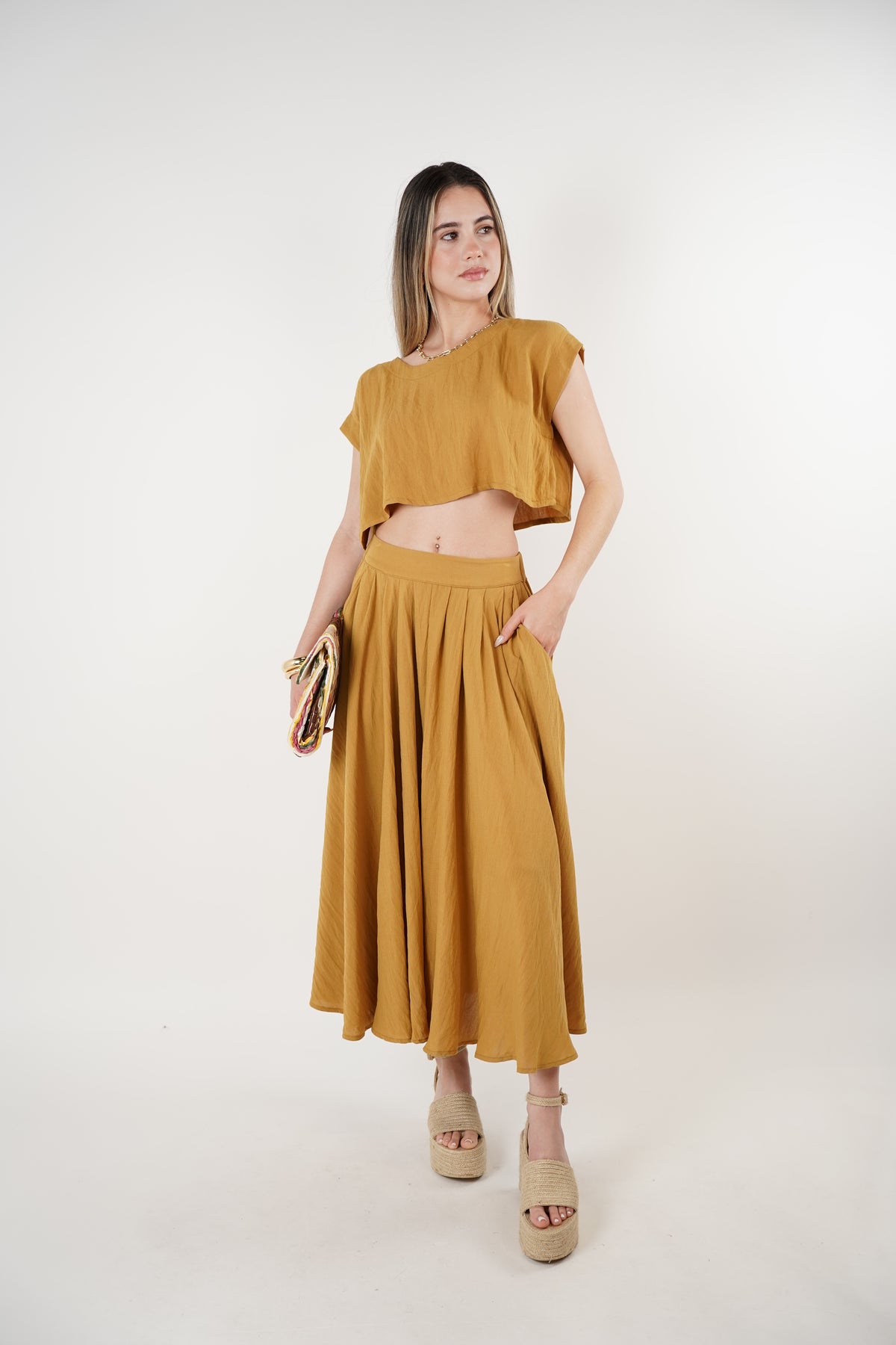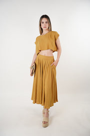 Meta Description: The Yavi Skirt Set features a cropped high-low top and pleated maxi skirt in rich mustard. Flowy, flattering, and effortlessly chic.