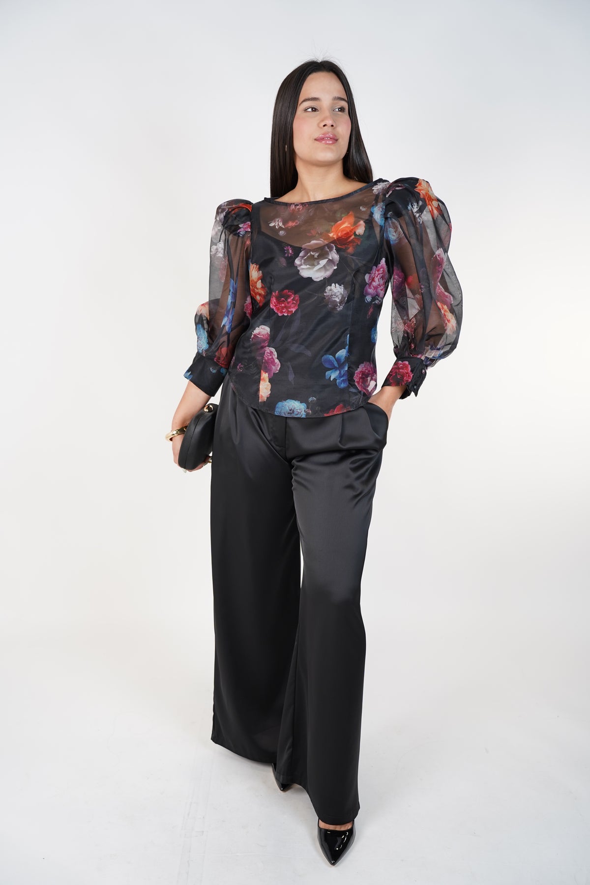 Model is showcasing the Zorevia Floral Puff Sleeve Top in studio lighting to highlight the floral print, sheer texture, and sleeve volume.