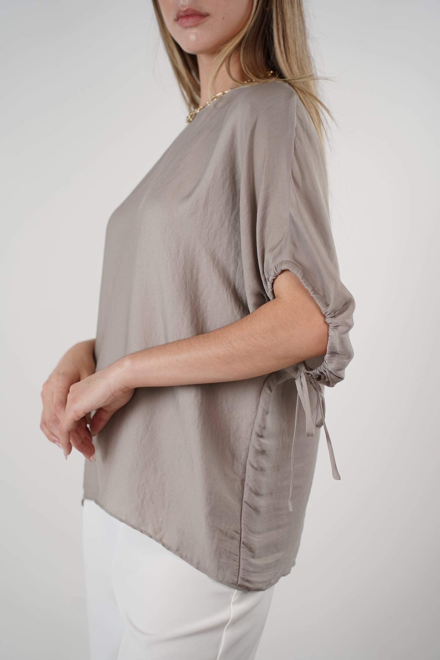 Woman wearing the Zovi Flaca Top in taupe with ruched sleeves and white pants, styled with gold bangles and chain necklace.