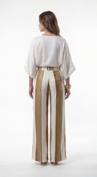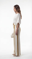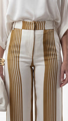 White and brown striped high-waisted wide-leg pants with tailored fit styled with a soft blouse and neutral accessories.